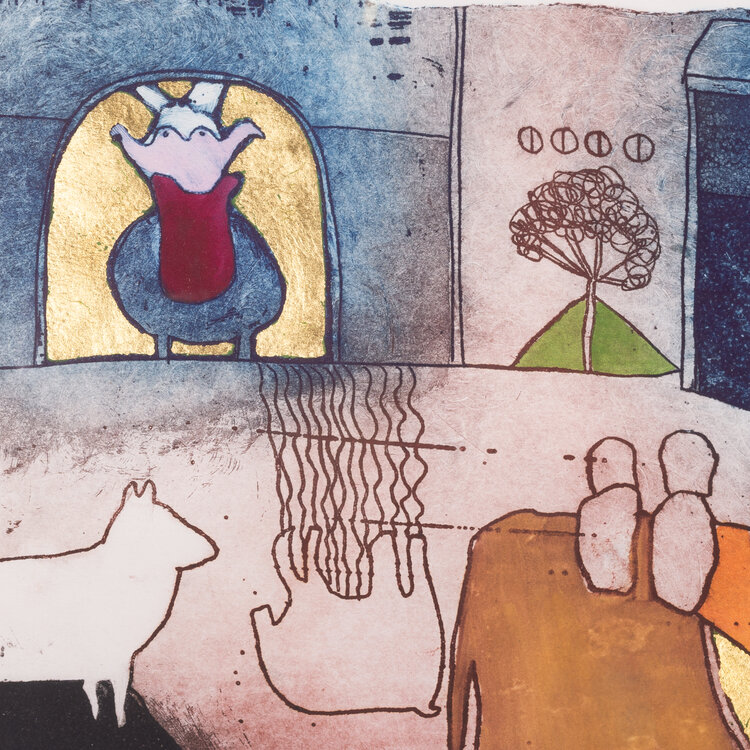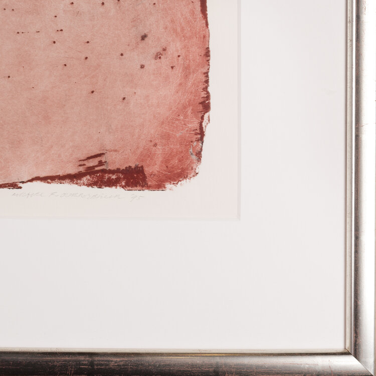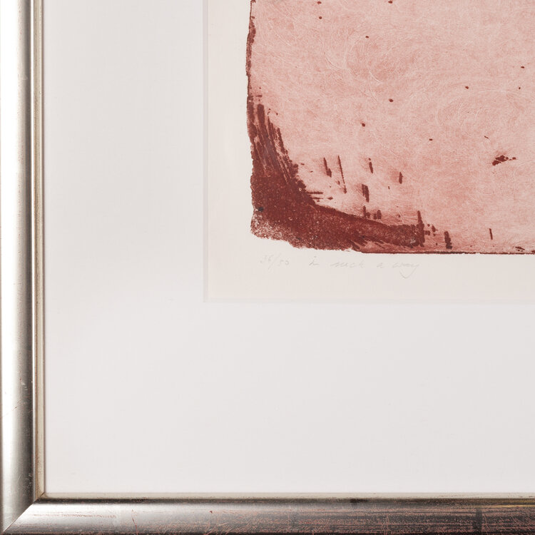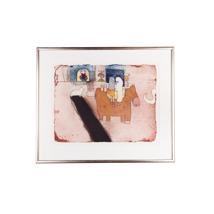 Michel van Overbeeke, 'In such a way', 1995. Kleurenets in zilverkleurige lijst, oplage 36/50. Abstracte voorstelling van een paard met twee figuren op de rug, gedrukt in bruintinten, blauw en bladgoud. Linksonder oplagenummer en titel, rechtsonder signatuur en jaar. Michel van Overbeeke (Den Haag, 19 juli 1942 - 24 juni 2024) is een Nederlandse kunstenaar die werkt in glaskunst, grafiek, keramiek en schilderkunst. Hij genoot zijn opleiding aan de Amsterdamsche Grafische School. Zijn vroege werk bestaat voornamelijk uit grafiek, tekeningen en schilderijen. Later breidde hij zijn kunde uit door monumentale kunstwerken in opdracht te vervaardigen in verschillende materialen. Onder andere het glas-in-loodraam in de Sint-Bavokerk te Haarlem en de kroonluchters in Paviljoen Welgelegen zijn van zijn hand. Van Overbeeke heeft geëxposeerd in onder andere het Frans Hals Museum, het Stedelijk Museum Zwolle en het Stedelijk Museum Kampen. Conditie: lijst toont gebruikssporen, zoals krasjes op de zijkant. Afmeting: 73 x 87 cm.
