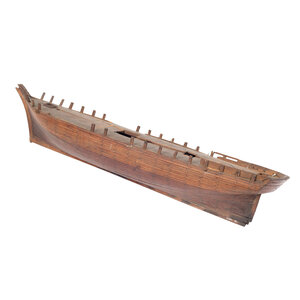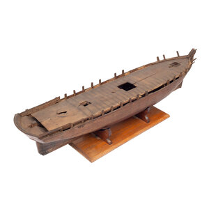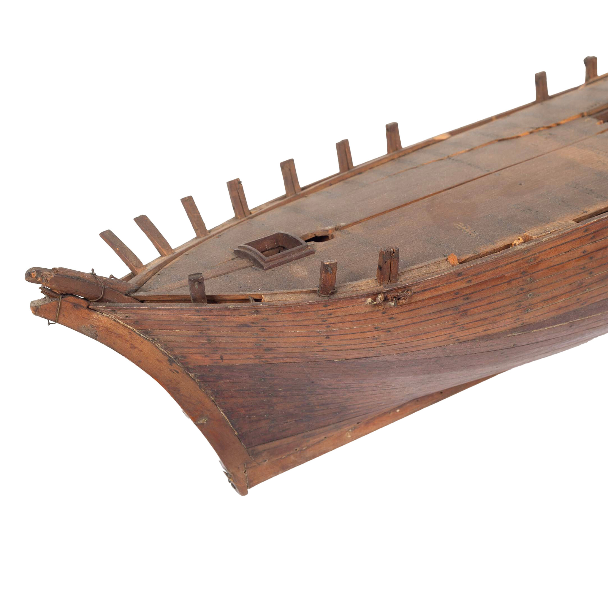 Houten rompmodel van een driemastschip met standaard. Zonder dekopbouw, masten of tuigage. Datering: midden negentiende eeuw. Conditie: incompleet, op diverse plekken beschadigd. Afmetingen: ca. 16 x 64 x 14,5 cm