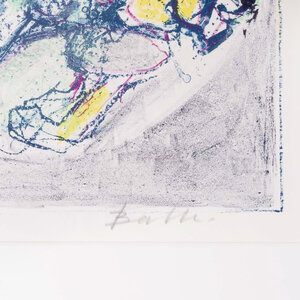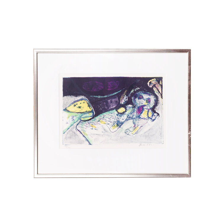 Mogens Balle, Compositie, jaartal onbekend. Zeefdruk op papier in zilverkleurige lijst, oplage 15/150. Abstracte compositie van fantasiefiguren in paars, zwart, groen en geel. Signatuur rechtsonder. De Deense kunstenaar Mogens Balle (1921-1988) was als schilder en schrijver aangesloten bij de Cobra-beweging. In zijn werk speelden fantasiefiguren de hoofdrol. Vanaf de jaren 60 maakte hij ook bronzen beelden van zijn fantasiefiguren. Conditie: goed. Afmetingen lijst: 47 x 57 cm.