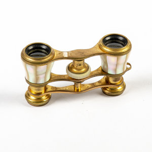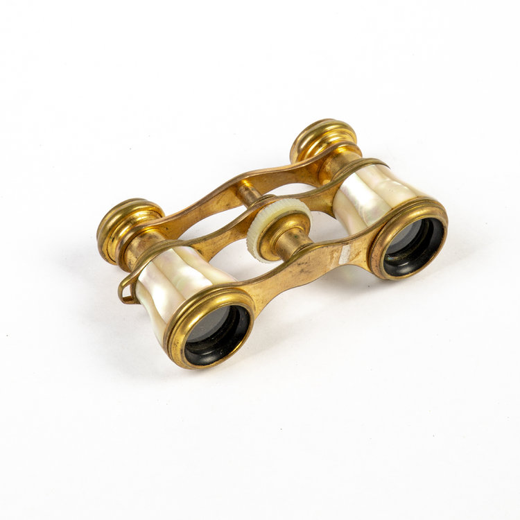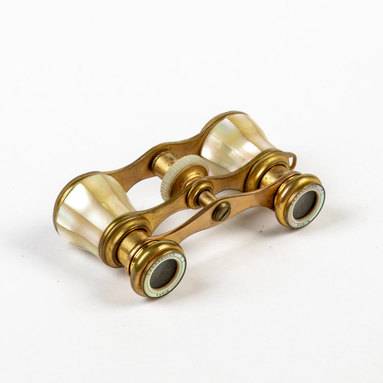 Parelmoer toneelkijker in doosje, omstreeks 1900. Geelkoper, parelmoer en leer, doosje 5 x 10.7 x 4.5, toneelkijker 4.7 x 8.9 x 3 cm. Toneelkijker gemerkt 'Carpentier Ft Paris' op de kijkgaten. Aan de zijkant zit een ringetje waar men een hangsel aan kan bevestigen, om de toneelkijker aan de pols te kunnen laten hangen bijvoorbeeld. De kijker zit in een verstevigd doosje met geelkoperen sluiting en blauwe voering van zijde-achtige stof. De buitenzijde is groen, maar lijkt donkerder te zijn geweest. Het doosje is waarschijnlijk niet het originele doosje bij de toneelkijker; de afdrukken van kijkgaten in het doosje komen niet overeen met de huidige toneelkijker. Conditie: goed tot matig, de toneelkijker is in goede staat met lichte gebruikssporen en tekenen van ouderdom zoals slijtage aan het geelkoper en een beetje vuil in de glazen. Het doosje is veel gebruikt waardoor het leer is versleten. Op sommige plekken is de stof licht beschadigd door uitvoerig gebruik en ouderdom.
