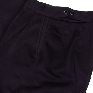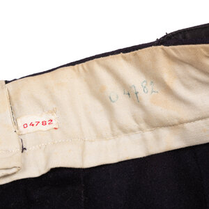 Marine broek, 1955. De marineblauwe broek heeft een hoge taille, een knoopsluiting, twee steekzakken en aan de rechterachterkant een broekzak met klep. Koninklijke Marine, maat 50. Conditie: De broek is gedragen, heeft slijtplekken, met name aan de onderrand van de broekspijpen. Afmetingen: lengte ca. 110 cm, omtrek tailleband ca. 82 cm.