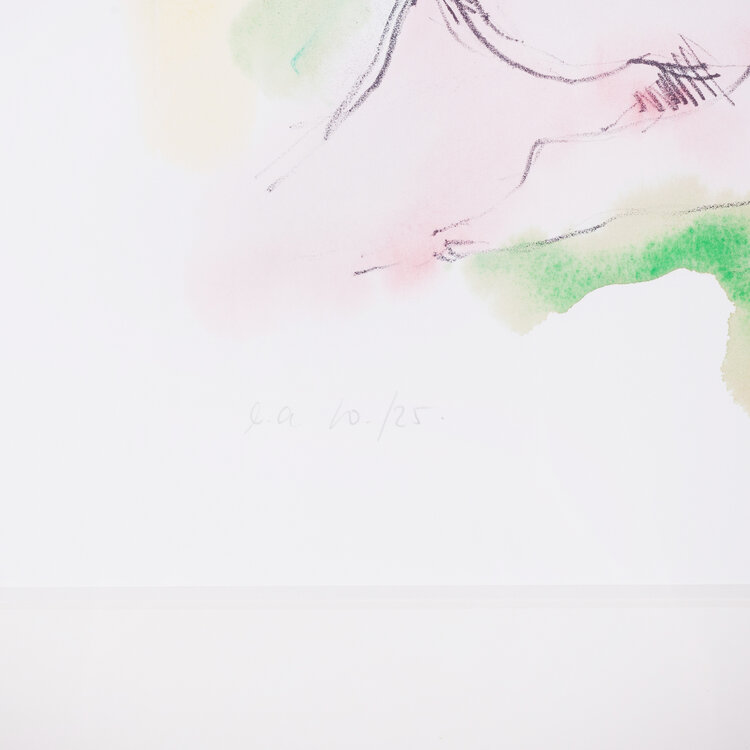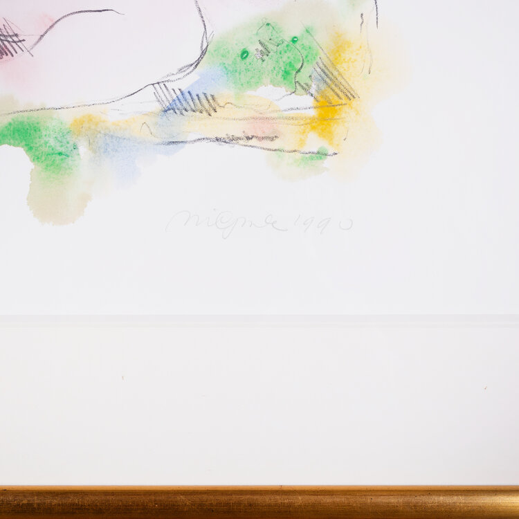 Nic Jonk, 'Op de sofa', 1990. Met de hand ingekleurde litho in goudkleurige houten lijst, oplage e.a. 10/25. Kleurrijke voorstelling met een liggende naakte vrouw tussen rode bloemen. Signatuur rechtsonder. Conditie: goed, met lichte gebruikssporen aan de lijst. Afmetingen passe-partout: 44 x 60 cm; lijst: 67 x 91 cm.