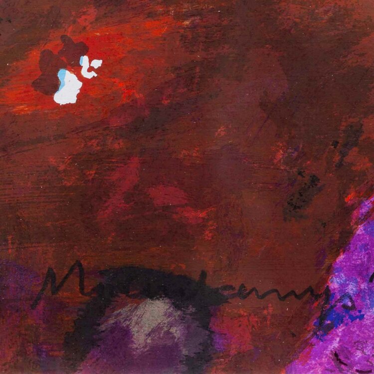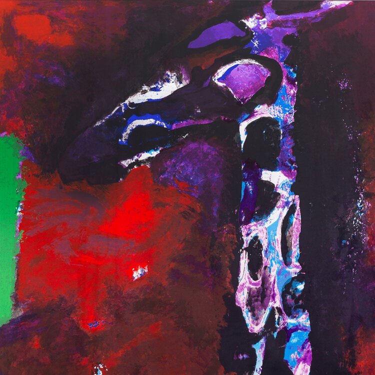 Nico Molenkamp, Giraf, jaartal onbekend. Zeefdruk in zonder lijst, oplage van 200. Voorstelling van een giraf in paars voor een rood-groene achtergrond. Linksonder signatuur en oplagenummer. Conditie: goed. Afmeting lijst: 87 x 80 cm.