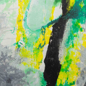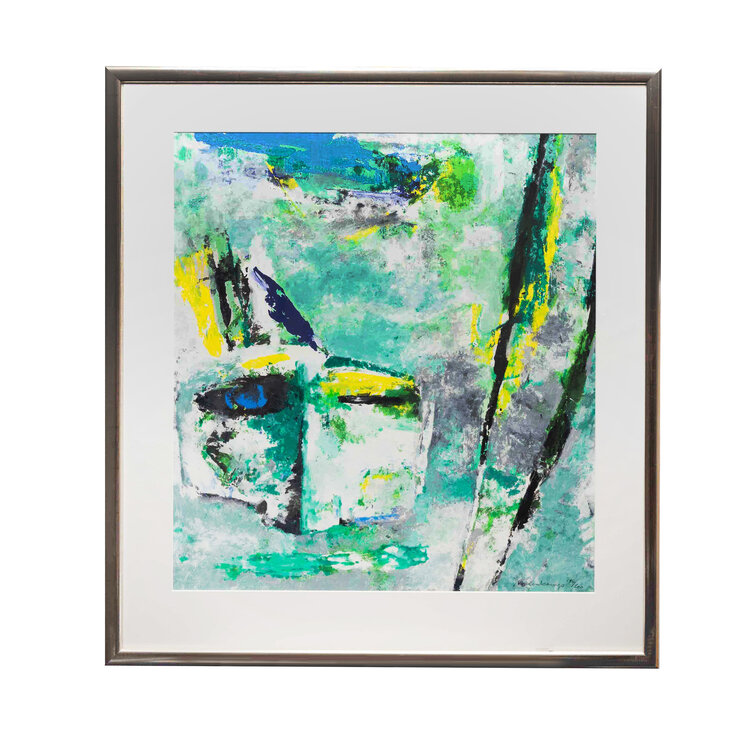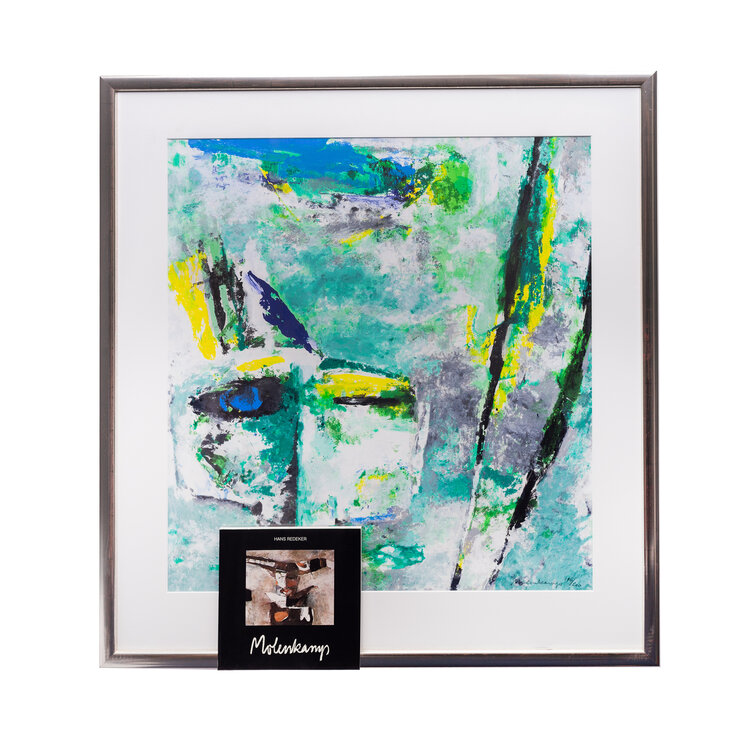 Nico Molenkamp, Masker, jaartal onbekend. Zeefdruk in zilverkleurige lijst, oplage 192/200. Abstracte voorstelling in groen, bauw, geek en zwart waarin links een maker te onderscheiden is. Linksonder signatuur en oplagenummer. Het werk is ingelijst achter museumglas met passe-partout. Bij het werk wordt een boek door Hans Redeker over de kunstenaar geleverd. Conditie: goed, lichte gebruikssporen aan lijst. Afmeting lijst: 110 x 101 cm.