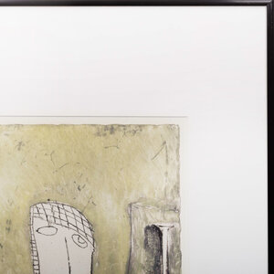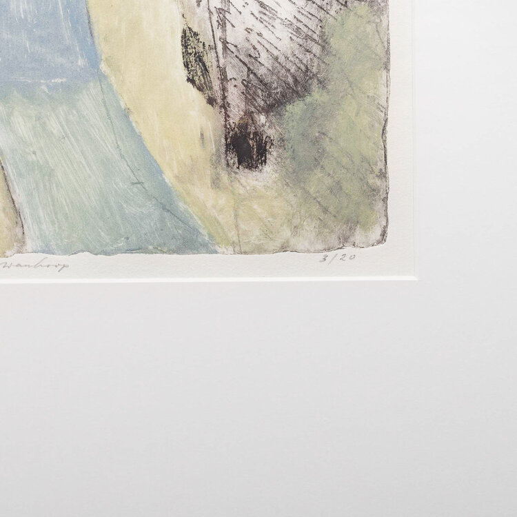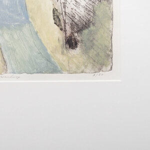 Noor Sternheim (Amsterdam, 1943), 'Lord wanhoop', 1989. Ets in zwarte lijst, oplage 3/20. Figuur in wit en blauw met ernaast een hond in groen-tinten. Signatuur linksonder. Conditie: goed met enkel lichte gebruikssporen aan de lijst. Afmetingen lijst: 65,5 x 51 cm; beeldvlak: 35,5 x 29 cm.