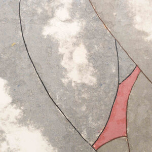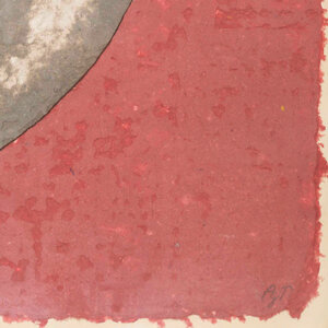 P. Gentenaar-Torley, Knot, jaartal onbekend. Gemengde techniek op handgemaakt papier in metalen lijst. Abstracte voorstelling in grijs en rozen met zwarte lijnen. Signatuur rechtsonder. Conditie: goed, lichte gebruikssporen op de lijst. Afmetingen: 79 x 79 cm.