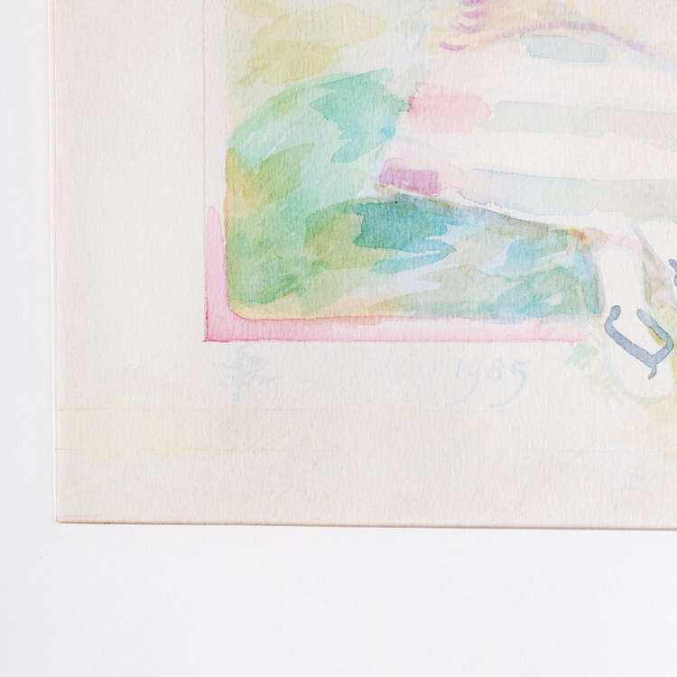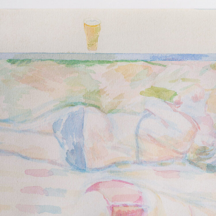 Peter Kouthoofd, Een dagje naar buiten (2). Aquarel van twee liggende figuren. Linksonder is het werk gedateerd. Datering: ca. 1985. Conditie: het werk is in goede staat. De lijst heeft lichte schade opgelopen. Afmetingen: ca. 52,0 x 76,0 cm.
