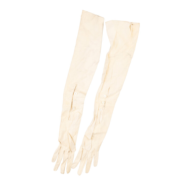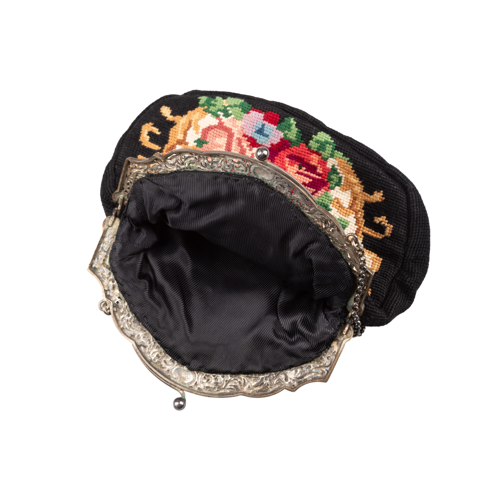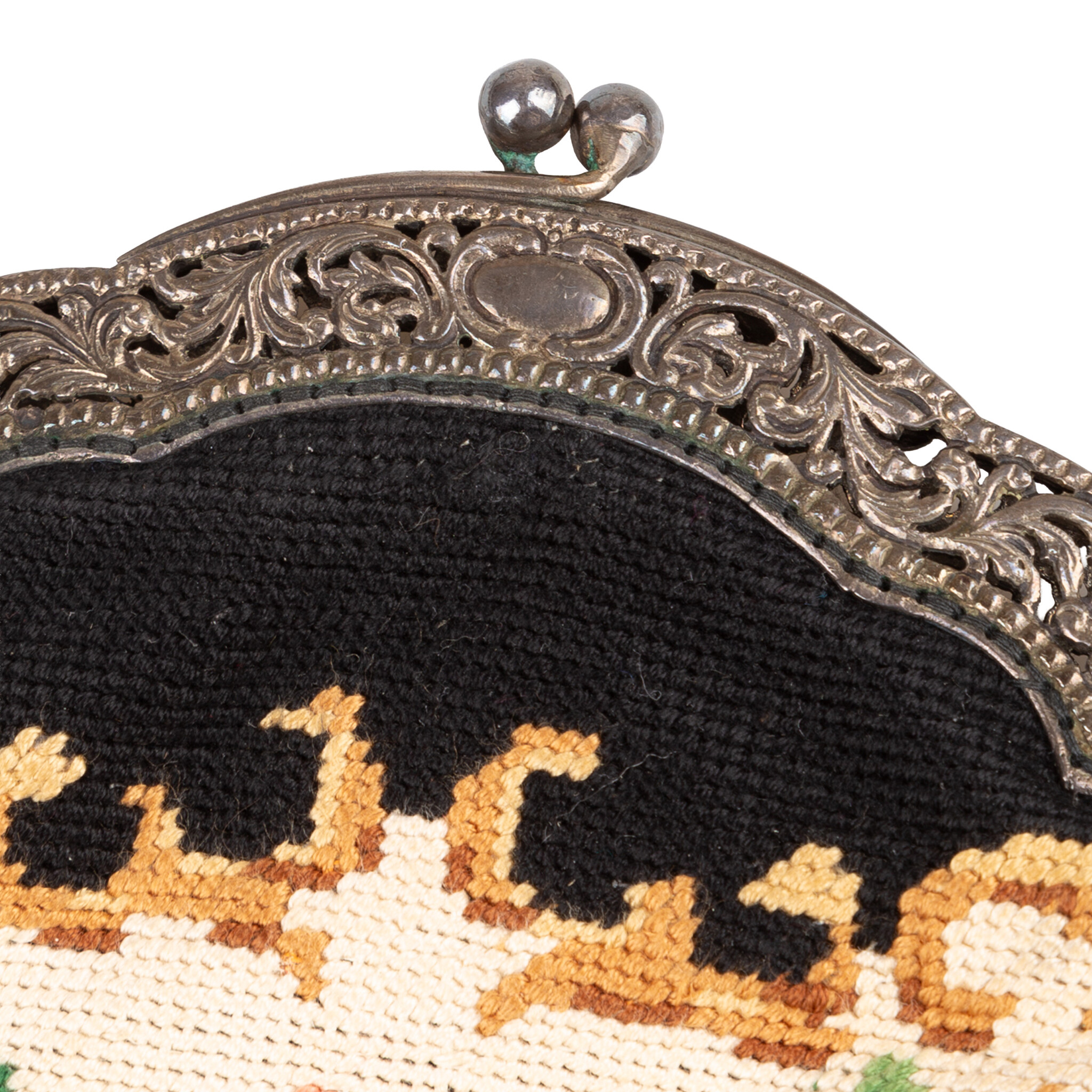 Petit point avondtas met avondhandschoenen. Datering onbekend. Geborduurde avondtas met bloemmotief in petit point steek. Het tasje heeft een decoratieve metalen beugel met draagketting. De binnenzijde is bekleed met zwarte binnenvoering; Een paar crèmekleurige avondhandschoenen van suède, maat 7 1/4. Conditie: sporen van ouderdom, het tasje en de handschoenen zijn in goede staat. Afmetingen avondtas: 16 x 18 x 2 cm; hoogte met hengsel 28 cm. Afmetingen handschoenen: ca. 49 x 6 cm.