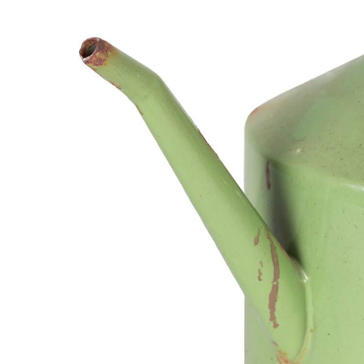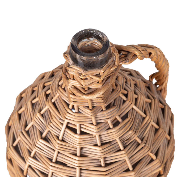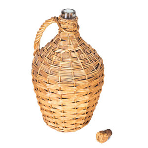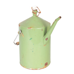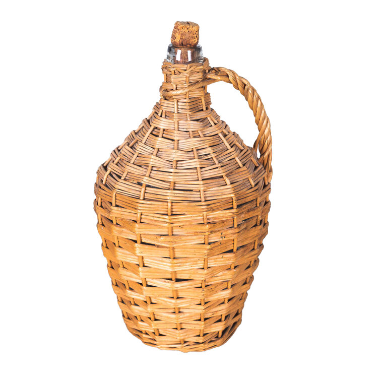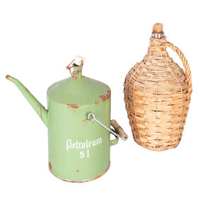 Geëmailleerde groene petroleumkan en rieten wijnfles met kurk. Datering 20ste eeuw. Petroleumkan met groen emaille en opschrift in witte letters "Petroleum 5 l". Het heeft een houten handvat en wit keramieken dop. De glazen mandfles is omweven met riet waarin een handvat verwerkt is. Bovenop een vierkante kurk. Conditie: de mandfles is nog in erg mooie staat; de petroleumkan toont roestplekken en beschadigingen in het hout. Afmetingen: petroleumkan: 33 x 34 x 19 cm; mandfles: 38 x 20 x 20 cm.