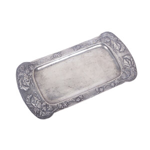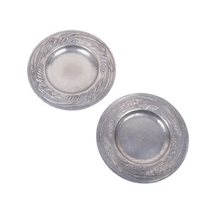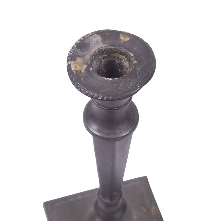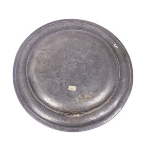 Tinnen schotel, tinnen kandelaar, schaal en sierbordjes, datering onbekend. Ronde schotel gemaakt van tin. In de rand van de schotel zijn de letters I - B - C gegraveerd. Conditie: vertoont gebruikerssporen, zoals diepe krassen. Afmetingen: hoogte 2.5 cm x Ø 27 cm; Antieke kandelaar gemaakt van tin, waarvan de zeshoekige kolom is vastgeschroefd aan de voet. Op de rand van de vierkante voet zit rondom een sierrandje. In de zijkant van de voet staat "FEIN" gegraveerd. Conditie: vertoont gebruikssporen, zoals beschadigingen en kaarsvet. Afmetingen: 21 cm hoog; voet Ø 8 cm; Schaal en sierbordjes. Op de rand van de schaal staat een bloemmotief. Op de randen van de twee sierbordjes staan verschillende motieven van graan afgebeeld. De schaal en sierbordjes hebben een coating dat lijkt op tin. Conditie: gebruikssporen, zoals krasjes. Afmetingen schaal: 16 cm breed, 32 cm lang. Afmetingen bordjes: Ø 18.5 cm.