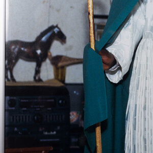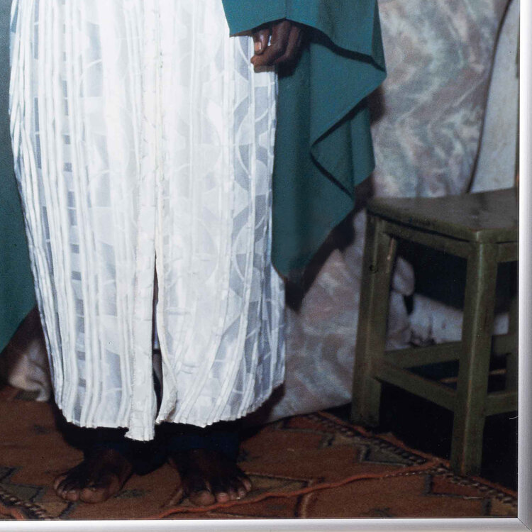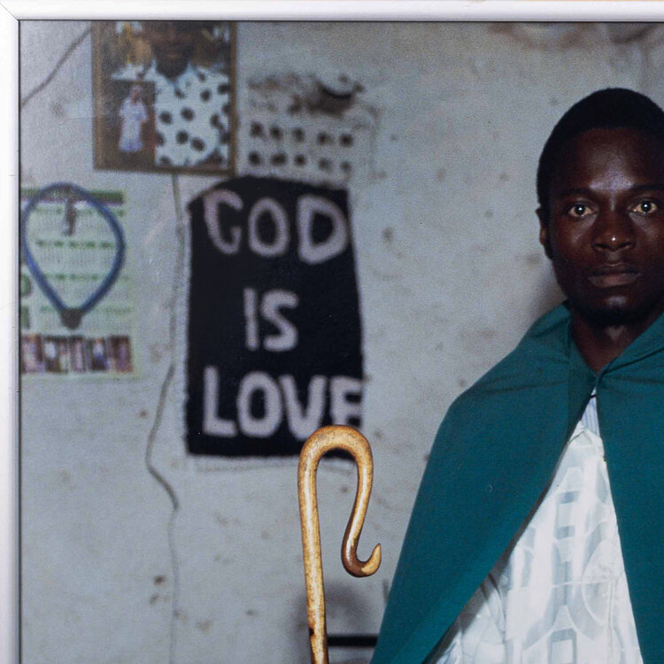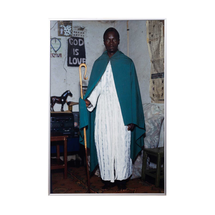 Foto van Andrew Curling (1970, Harare, Zimbabwe), 2001. Kleurenfoto in lijst van een man in traditionele Afrikaanse kleding in Mutare, Zimbabwe. De foto komt uit een serie van vier foto's. Andrew Curling was voor deze serie gefascineerd door mensen met een sterke religieuze roeping, die opereren in grote ruimtes, maar zelf wonen in een klein onderkomen. Hun liefde voor God kende geen grenzen. Deze foto behoort tot de foto expositie 'Les intérieurs du monde' uit 2001 in het Zaans Museum. Een fascinerend document van interieurs in 7 steden door 14 fotografen uit 5 landen, in samenwerking tussen de gemeenten Zaanstad en Haarlem met hun zustersteden. Mutare heeft een stedenband met Haarlem. Conditie: Vertoont gebruikssporen. Afmetingen lijst: 55 x 38 cm.