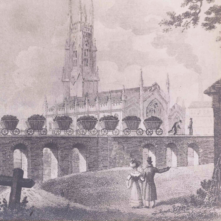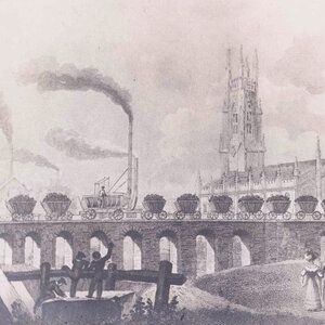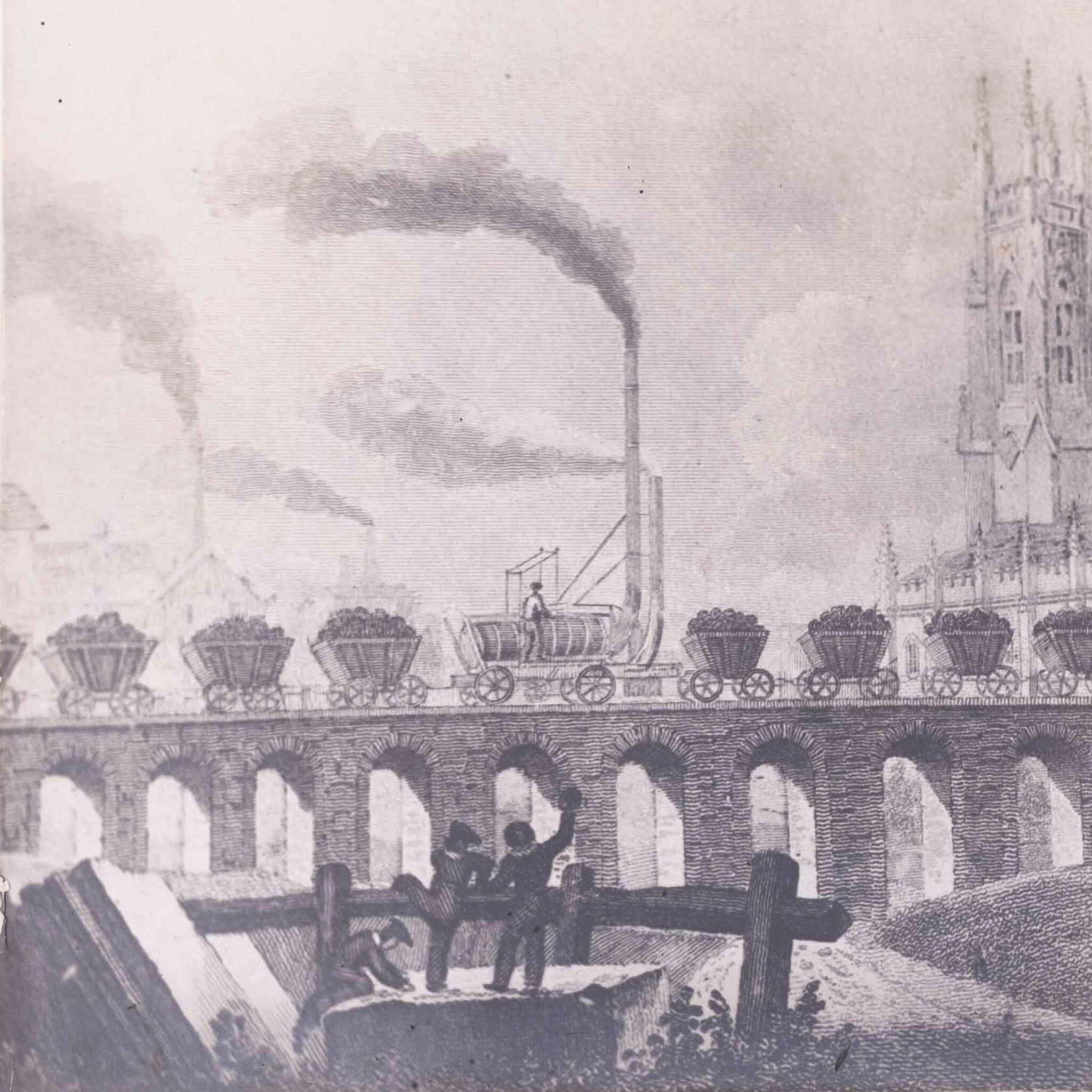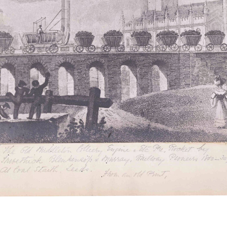 Foto van de prent 'Christ Church and coal staith, Leeds', gegraveerd door Nathaniel Whittock. Datering: 1829. Afbeelding van een stoomlocomotief met kolenwagons van de Middleton Colliery Railway, die over een brug rijdt. Conditie: De foto toont sporen van ouderdom. Verkleuring, vlekken en kleine beschadigingen aan de randen. Afmetingen foto: 28 x 39 cm.