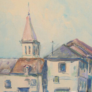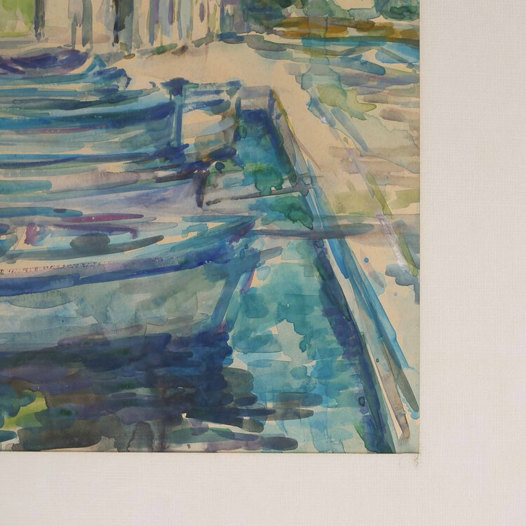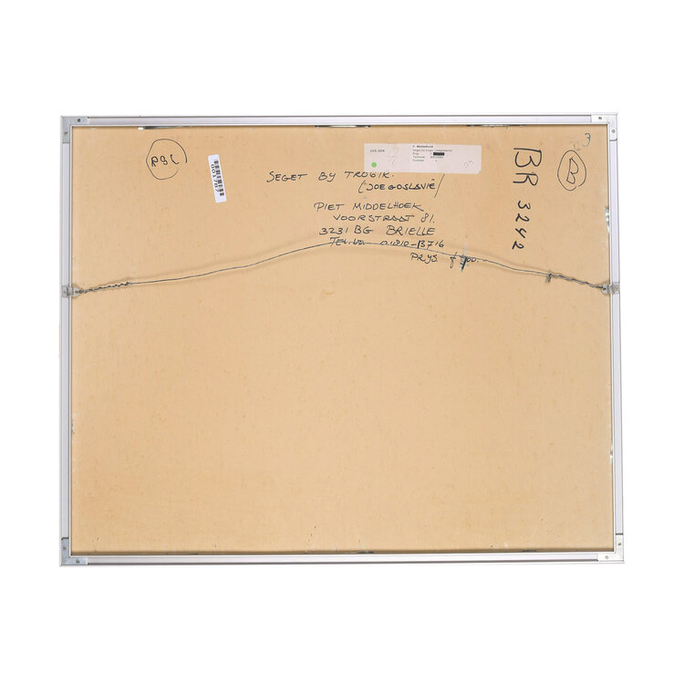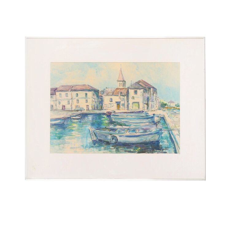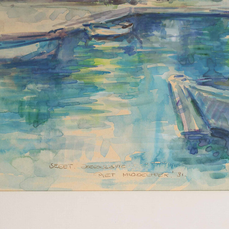 Piet Middelhoek, Seget bij trogiv (Joegoslavie), 1981. Aquarel op papier in metalen lijst. Kleurrijke schildering van boten in het water met op de achtergrond woningen en een kerk. Titel, signatuur en jaar linksonder. Conditie: gebruikssporen aan lijst. Afmeting werk zonder lijst: 40 x 58 cm.