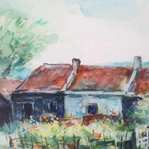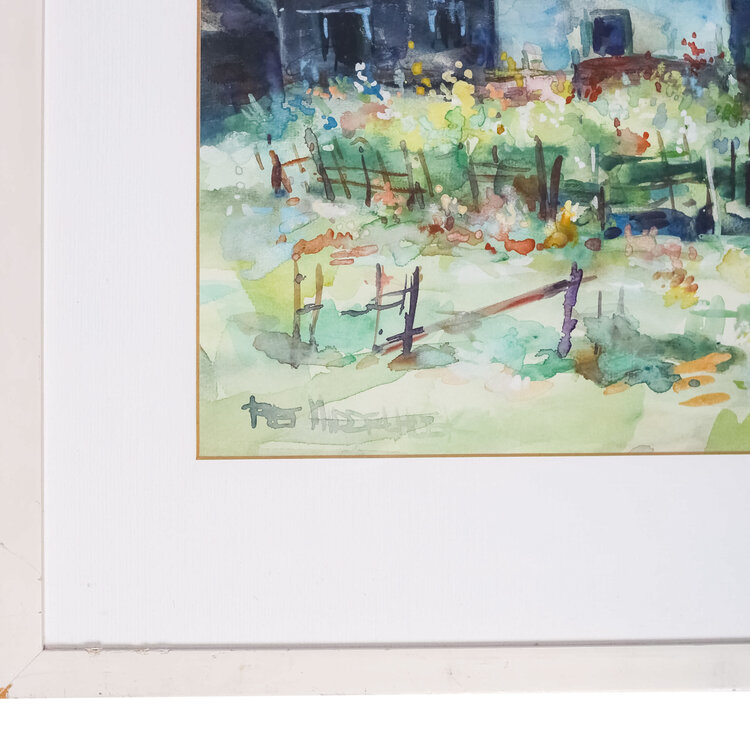 Piet Middelhoek, Stilleven op Noorbeek; Limburg, jaartal onbekend. Aquarel op papier in wit houten lijst. Kleurrijke schildering van twee woningen met daarachter een kerk. Signatuur linksonder. Conditie: gebruikssporen aan lijst en scheurtjes in de hoeken van het passe-partout. Afmeting werk zonder lijst: 43 x 58 cm.