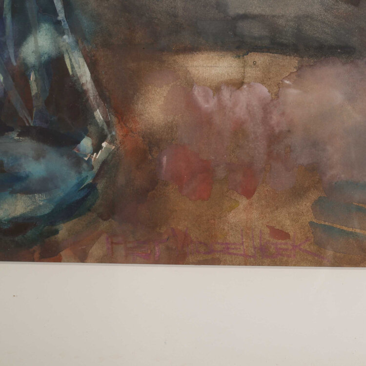 Piet Middelhoek, Stilleven met bloemen, jaartal onbekend. Aquarel op papier in metalen lijst. Kleurrijk stilleven van een vaas met diverse bloemen waaronder rozen en margrieten. Signatuur rechtsonder. Conditie: gebruikssporen aan lijst en linksboven een deukje het passe-partout. Afmeting lijst: 80 x 70 cm.