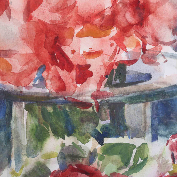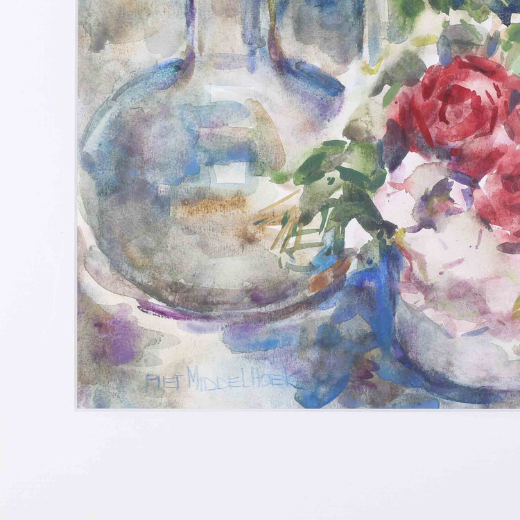 Piet Middelhoek, Stilleven met gladiolen, rozen en hortensia, 1991. Aquarel in witte lijst. Kleurrijk stilleven met een karaf met dop, vaas met gladiolen en daarvoor een bos rozen met hortensia. Signatuur linksonder. Conditie: paar beschadigingen aan de lijst. Afmeting werk zonder lijst: 67 x 45 cm.