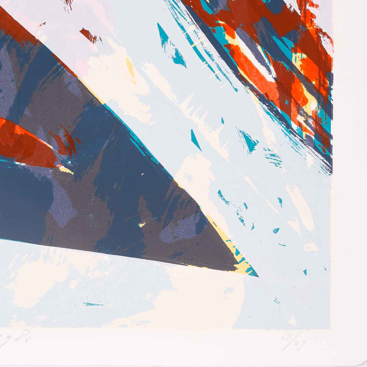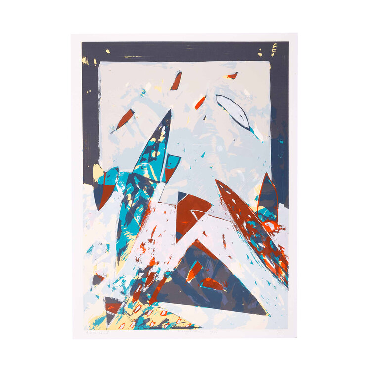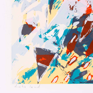 Piet Warffemius, Dinkaland, 1984. Zeefdruk op papier zonder lijst, oplage 13/27. Abstract werk met verschillende vormen in de kleuren blauw, bruin en zwart. Signatuur middenonder. Conditie: het papier toont hier en daar gebruikssporen, aan de achterkant resten van tape. Afmeting papier: 66 x 50 cm.