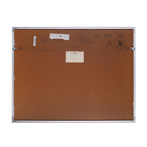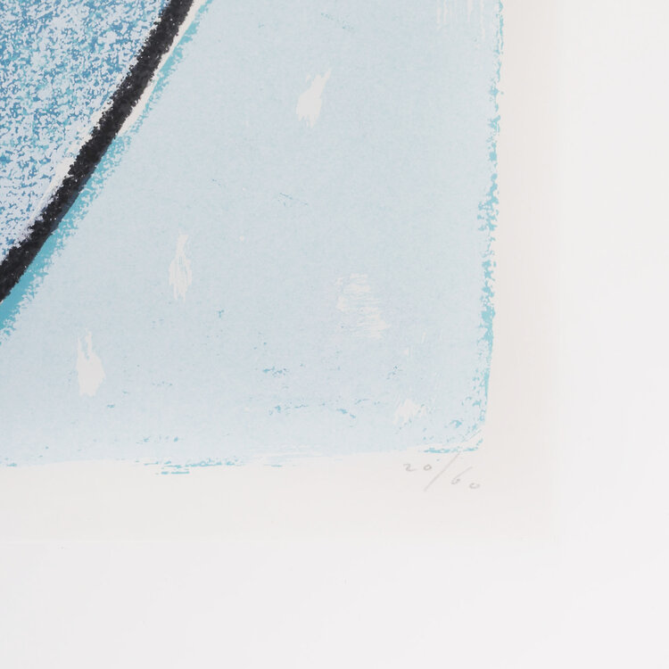 Piet Warffemius, E bida bow diawa, 1990. Zeefdruk op papier in metalen lijst, oplage 20/60. Abstracte compositie van vormen in blauw met zwarte lijnen en een vorm in rood. Linksonder titel, in midden signatuur en rechtsonder jaartal en oplagenummer. Conditie: werk is in goede staat, gebruikssporen aan lijst. Afmetingen werk zonder lijst: 55 x 72 cm; incl. lijst: 71,5 x 90 cm.