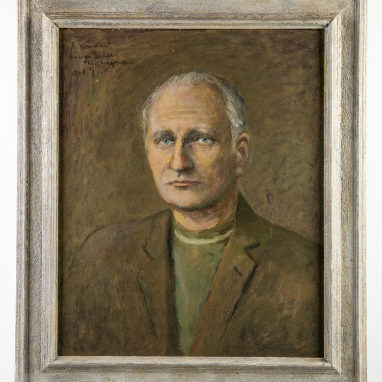 Theo Swagemakers, Portret Herman Richter, 1972. Olieverf op paneel, werk 54.8 x 44.6 cm, lijst 68 x 57.7 cm. Levendig portret met veel kleur in het gezicht, gesigneerd linksboven. Het werk is ingelijst in een houten lijst. De donkere achtergrond laat de lichte ogen van de geportretteerde naar voren komen. Theo Swagemakers (1898-1994) is een bekende Nederlandse schilder van voornamelijk portretten en stillevens. Hij genoot zijn opleiding in Brussel en Parijs en heeft verschillende beroemdheden mogen portretteren, zoals een groot deel van de Koninklijke familie. Hiervoor heeft hij de Thérèse van Duyl-Schwartzeprijs in ontvangst mogen nemen in 1958. Conditie: het werk is in prima conditie. Het oppervlak van de verf heeft zeer kleine krasjes op sommige plekken, met name linksboven. De lijst heeft een beschadiging aan de rechterzijde.