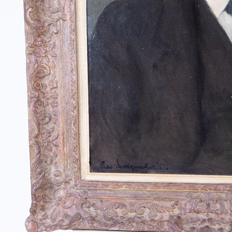 Theo Swagemakers, Portret Johannes Cornelis Brocken (1871-1959), 1952. Olieverf op doek, doek 69.2 x 49 cm, lijst 89 x 69.4 cm. Prachtig geschilderd portret met warme vleestonen in het gezicht die contrasteren met de donkergroene achtergrond. Gesigneerd linksonder. Het portret is ingelijst in een bruine lijst met allerlei plantmotieven en krullende ranken. Opschrift linksboven 'AE T. LXXX.'. Theo Swagemakers (1898-1994) is een bekende Nederlandse schilder van voornamelijk portretten en stillevens. Hij genoot zijn opleiding in Brussel en Parijs en heeft verschillende beroemdheden mogen portretteren, zoals een groot deel van de Koninklijke familie. Hiervoor heeft hij de Thérèse van Duyl-Schwartzeprijs in ontvangst mogen nemen in 1958. Conditie: het werk is in prima conditie. De lijst heeft enkele tekenen van ouderdom waar splijting te zien is, met name op de hoeken.