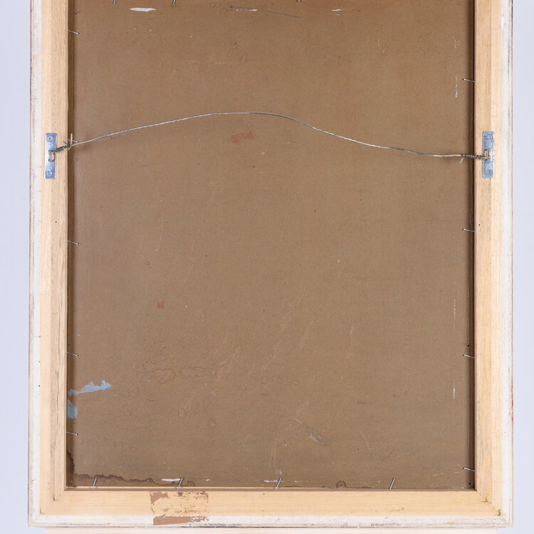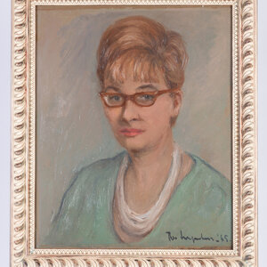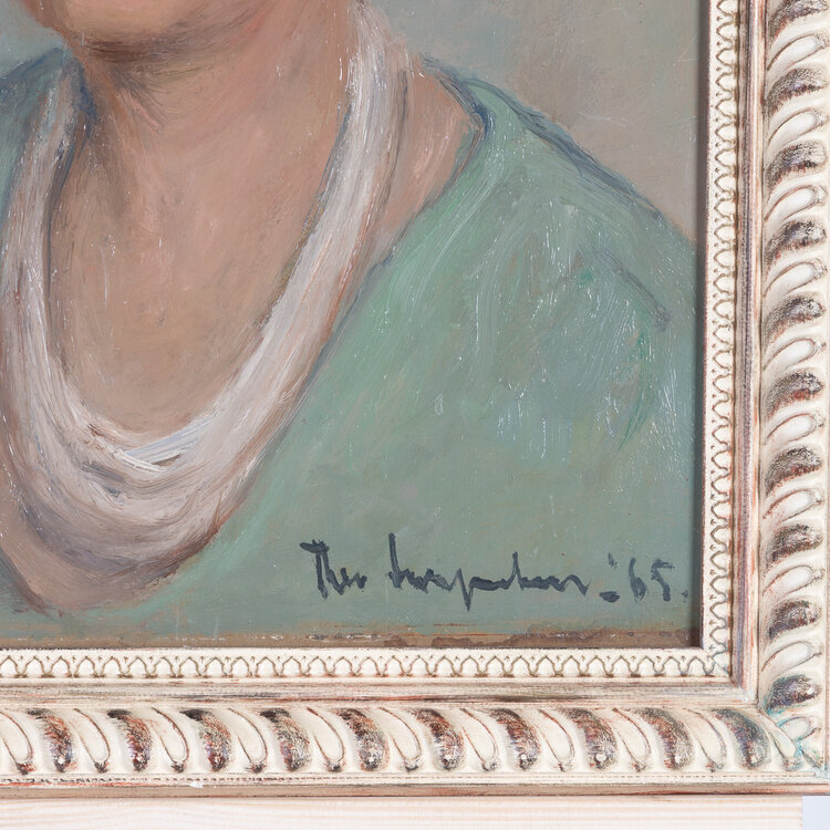 Theo Swagemakers, Portret van een vrouw, 1965. Olieverf op board, werk 54.5 x 45 cm, lijst 63 x 53 cm. Portret van een vrouw met een bril en opgestoken haar, gesigneerd rechtsonder. De kunstenaar heeft prachtige zachte en warme kleuren gebruikt. De lijst heeft een herhalend reliëf patroon. Theo Swagemakers (1898-1994) is een bekende Nederlandse schilder van voornamelijk portretten en stillevens. Hij genoot zijn opleiding in Brussel en Parijs en heeft verschillende beroemdheden mogen portretteren, zoals een groot deel van de Koninklijke familie. Hiervoor heeft hij de Thérèse van Duyl-Schwartzeprijs in ontvangst mogen nemen in 1958. Conditie: het werk is in prima conditie. Hier en daar zijn lichte krasjes zichtbaar op het oppervlak in strijklicht. Ook de lijst is in goede conditie.