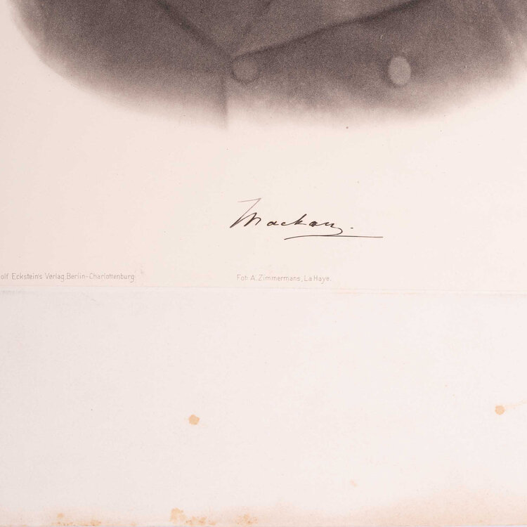 Portret van baron Æneas Mackay. A. Zimmermans, Adolf Ecksteins Verlag. Fotomechanische afdruk, mogelijk een heliogravure. Æneas baron Mackay (Nijmegen, 29 november 1838 – 's-Gravenhage, 13 november 1909) was minister-president van Nederland van 1888 tot 1891. Datering onbekend. Conditie: De prent is geplakt op een stevig karton. De prent heeft sporen van ouderdom. Verkleuring, vlekken en kleine beschadigingen. Afmetingen van papier prent: 30 x 19,5 cm; van karton 43 x 30,5 cm.