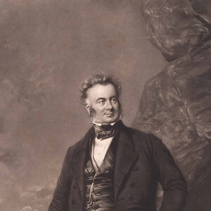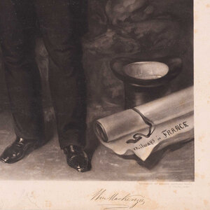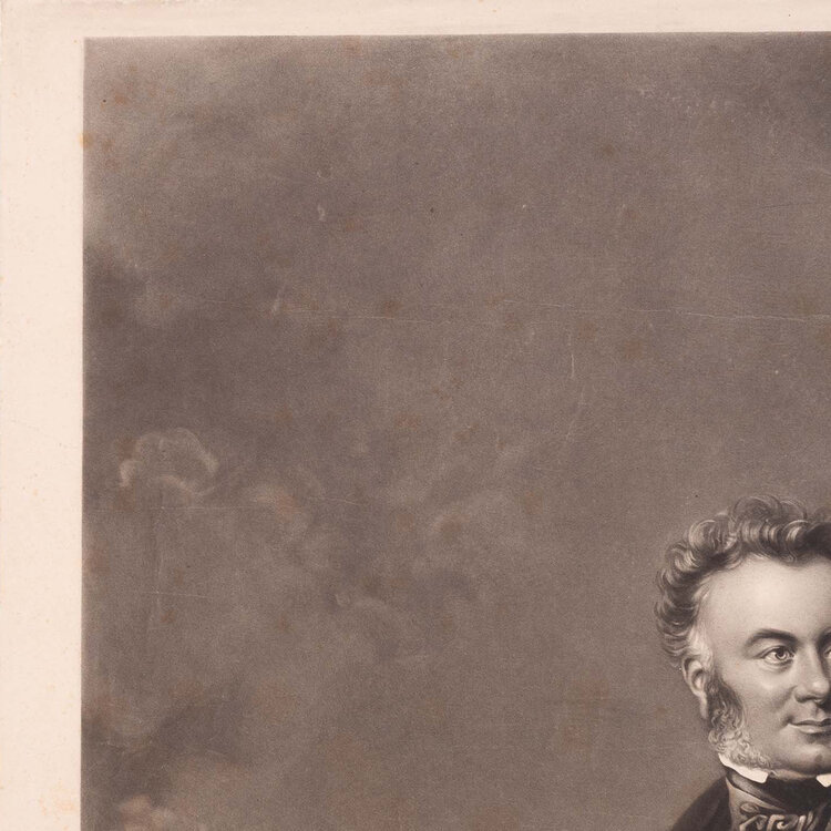 Portret van William Mackenzie, International railway contractor, door Ward, Illidge. Een mezzotint/ gravure door George Raphael Ward naar een portret gemaakt door Thomas Henry Illidge. Het origineel is geschilderd tussen 1844 en 1851. Het portret is van de Brits bouwkundig ingenieur William Mackenzie (1794 - 1851). Conditie: De prent heeft sporen van ouderdom, zoals vlekken en verkleuring. Er zitten kreuken, vouwen en beschadigingen in het papier en bovenin zit een scheur. Potloodkrassen aan de onderkant. Afmetingen: ca. 65 x 42 cm.