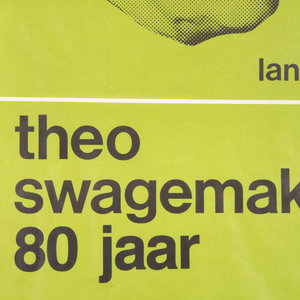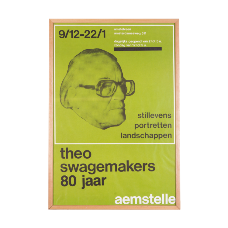 Poster van de tentoonstelling 'theo swagemakers 80 jaar' in Amstelveen, met een portret van de kunstenaar. Theo Swagemakers (1898-1994) is een bekende Nederlandse schilder van voornamelijk portretten en stillevens. Hij genoot zijn opleiding in Brussel en Parijs en heeft verschillende beroemdheden mogen portretteren, zoals een groot deel van de Koninklijke familie. Hiervoor heeft hij de Thérèse van Duyl-Schwartzeprijs in ontvangst mogen nemen in 1958. Datering: 1978. Conditie: de poster is in goede conditie. De lijst heeft lichte gebruikssporen. Afmetingen: ca. 57 x 39 cm.