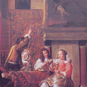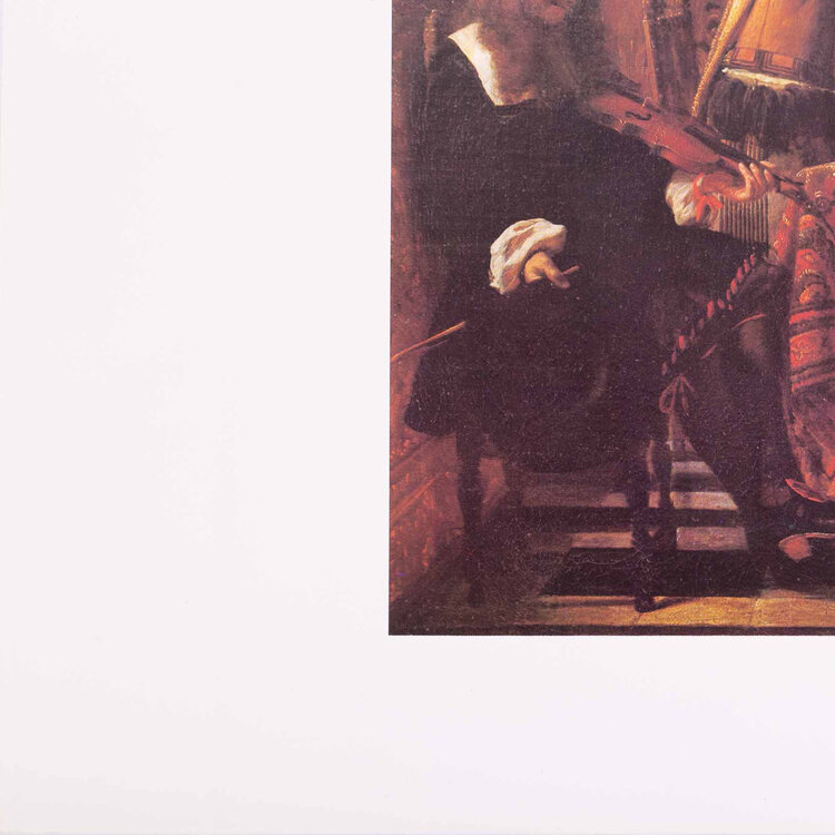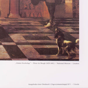 Ingelijste poster van het schilderij 'Galant Gezelschap' van Pieter de Hoogh (1629-1681). Afbeelding van een groep drinkende mensen om tafel in een 17-de eeuws interieur. Links een viool spelende man en rechtsonder een hond. Rondom het werk is een wit kader met rechtsonder te lezen: '"Galant Gezelschap" - Pieter de Hoogh (1629-1681) - Nationaal Museum - Lissabon.' Conditie: de poster heeft in het witte kader wat kreukeltjes, maar is verder in prima staat. De poster is iets te klein voor de lijst, waardoor er bovenin een klein randje te zien is. De lijst heeft lichte gebruikssporen. Afmetingen: ca. 52 x 69 cm.