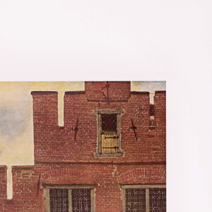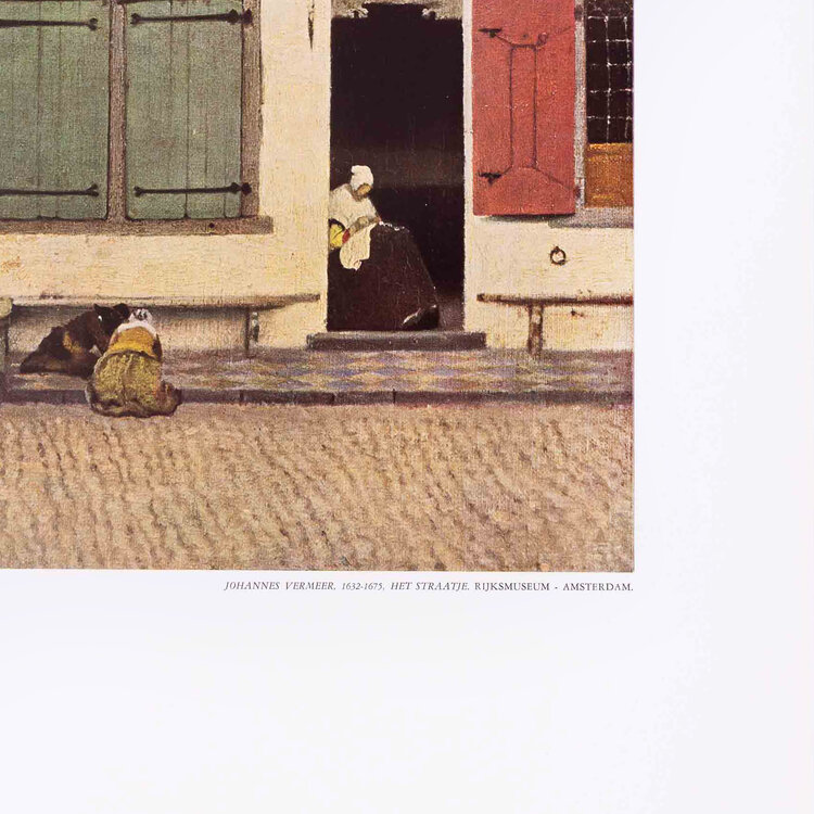 Poster van het schilderij 'Het straatje' van Johannes Vermeer (1632-1675). Afbeelding van een grachtenpand met in de deuropening een zittende vrouw, op de stoep twee spelende kinderen en aan de zijkant van het pand staat een gebogen vrouw. Rondom het werk is een wit kader met rechtsonder te lezen: 'Johannes Vermeer, 1632-1675, Het straatje. Rijksmuseum - Amsterdam.' Conditie: goed met enkel lichte gebruikssporen aan de randen en hoeken. Afmetingen ca: 40 x 54 cm.
