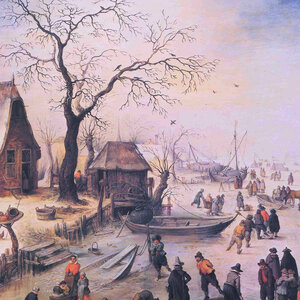 Poster van het schilderij 'Winterlandschap' van Peter Snayers (1592-1667). Een speels 17de eeuws tafereel van scchaatsende en sleeënde mensen op het ijs. Rondom het werk is een wit kader met linksonder te lezen: '"Winterlandschap" - Peter Snayers (1592-1667) - Staatliche Kunstsammlung - Kassel'. Conditie: goed met enkel lichte gebruikssporen aan de randen. Afmetingen ca: 49 x 69 cm.