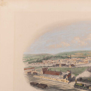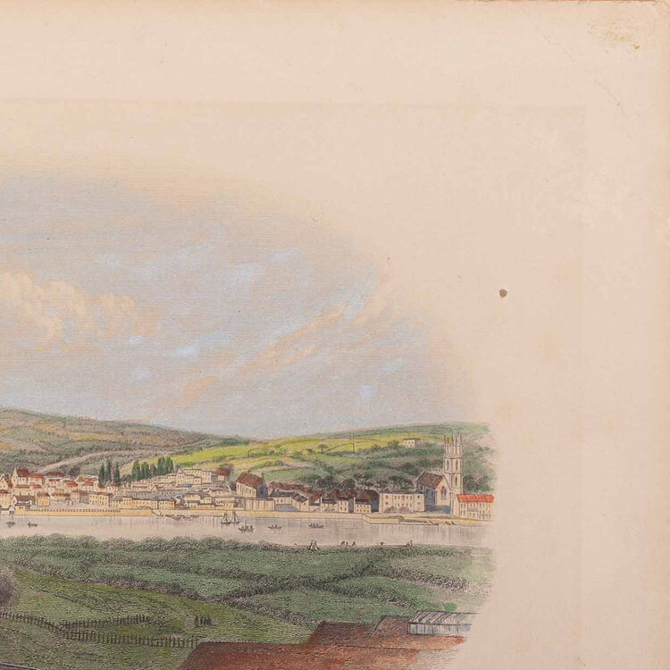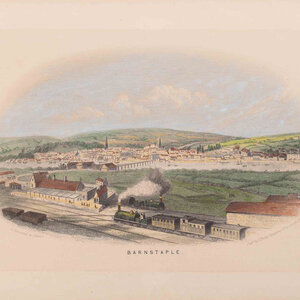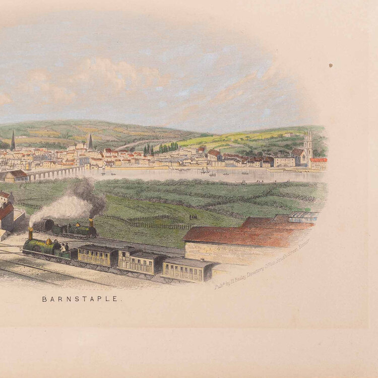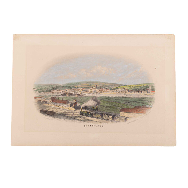Prent 'Barnstaple' getekend door G. Townsend en gepubliceerd door H. Besley. Ets en gravure met de hand ingekleurd. Datering: onbekend. Conditie: papier is verkleurd en kreukje rechter boven hoek. Afmetingen: ca. 16,5 x 24 cm.