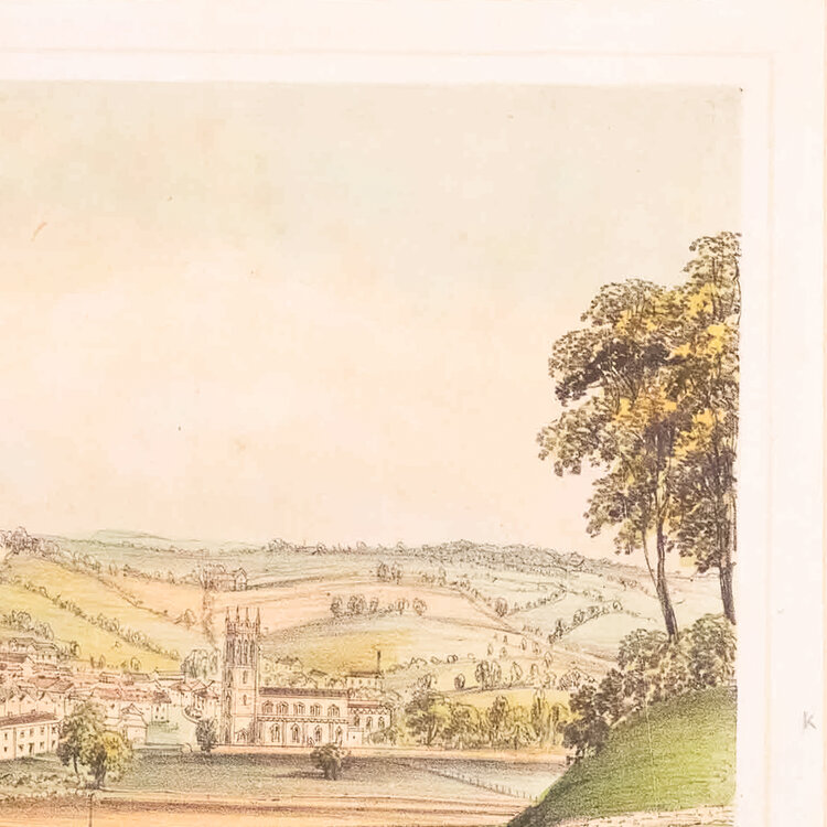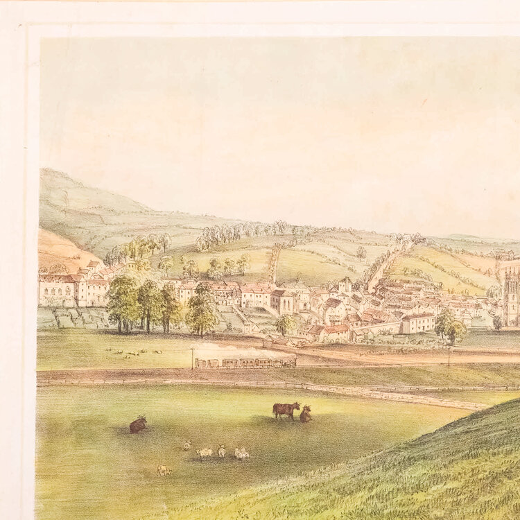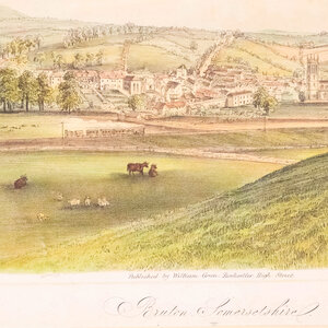 Prent 'Bruton Somersetshire'. Uitgegeven door William Green, Bookseller, High Street. Litho van het zicht op de stad Bruton met in het landschap een trein op de spoorlijn van de The Wilts, Somerset and Weymouth Railway. Datering: circa 1850. Conditie: De prent heeft sporen van ouderdom. Verkleuring, vlekken en kleine beschadigingen aan de randen. Afmetingen van papier prent: 26,5 x 33 cm.