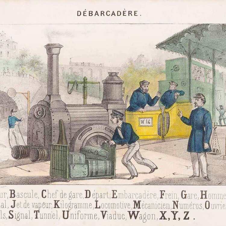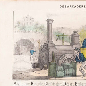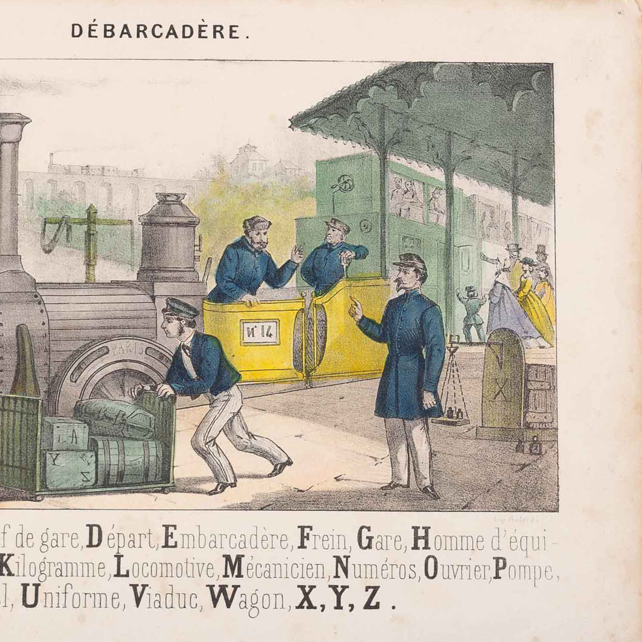 Prent 'Débarcadère'. Litho in blankhouten lijst, uitgeverij Magnin-Blanchard, drukker Godard, Parijs. Afbeelding van een stoomlocomotief op een station. Onder de tekening staan de letters van het alfabet met woorden uit de spoorwegwereld. Datering onbekend. Conditie: De prent heeft sporen van ouderdom. Verkleuring, vlekken en kleine beschadigingen aan de randen; gebruikssporen lijst. Afmetingen: lijst ca. 26 x 38 cm; papier prent ca. 18,5 x 26 cm.