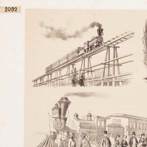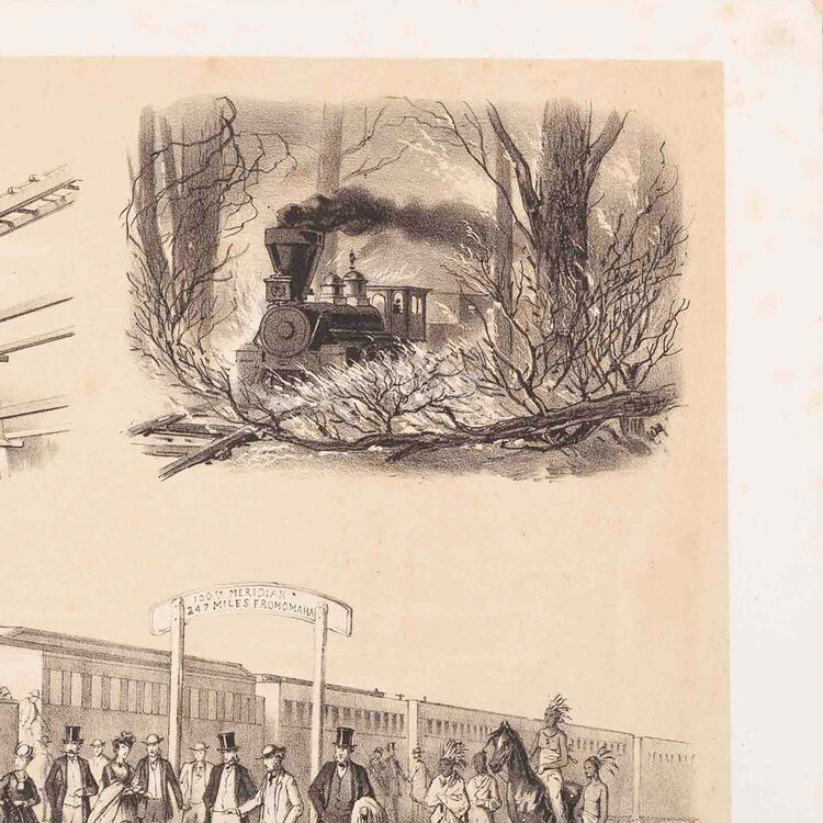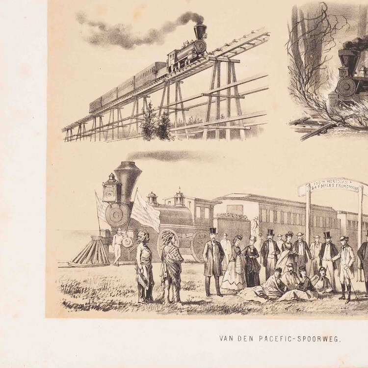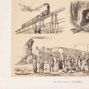 Prent 'Van den Pacefic-spoorweg'. Litho van Emrik & Binger. 'The Central Pacific Railroad' was een spoorwegmaatschappij in de Verenigde Staten. Het bedrijf staat vooral bekend om de aanleg van het spoor van Californië naar Utah als onderdeel van de eerste Transcontinental Railroad in Noord-Amerika. De aanleg van de spoorlijn begon in 1863 en vanaf 1869 was het mogelijk om in acht dagen van kust naar kust te reizen. Datering onbekend. Conditie: De prent heeft sporen van ouderdom. Verkleuring, vlekken en kleine beschadigingen aan de randen. Afmetingen van papier prent: ca. 22 x 30,5 cm.