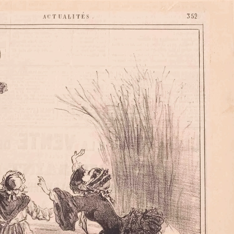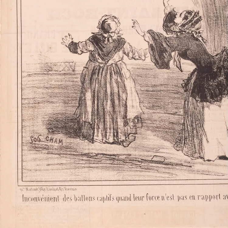 Spotprent 'Inconvénient des ballons captifs quand leur force n'est pas en rapport avec le poids des enfants'. Litho door Charles Amédée de Noé, 'CHAM', drukker Destouches, gepubliceerd door Maison Martinet, in blankhouten lijst. Prent vermoedelijk uit een krant, met een afbeelding van twee vrouwen die kijken naar een klein kind dat in de lucht wordt gehesen door een ballon. Vertaling van het Frans onderschrift: "Nadeel van vastgebonden ballonnen als hun kracht niet overeenkomt met het gewicht van de kinderen". Aan het einde van de 18e eeuw werd de ballonvaart uitgevonden, waardoor er veel afdrukken werden gemaakt met de ballon als onderwerp. Het National Air and Space Museum in Washington is ook in het bezit van een exemplaar. Datering: 19e eeuw. Conditie: De prent heeft sporen van ouderdom. Verkleuring, vlekken en kleine beschadigingen aan de randen. De prent zit vastgeplakt in een kartonnen mapje met opening waardoor de prent zichtbaar is. De tekst op de achterkant is licht zichtbaar. Afmetingen: lijst ca. 62 x 52 cm; papier prent: ca. 30 x 25 cm.