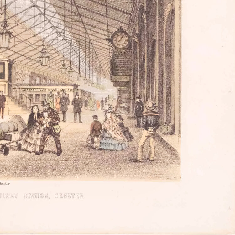 Prent 'Interior of the General Railway Station, Chester' door J. Gresty. Ingekleurde litho van het interieur van het nieuwe station halverwege de 19e eeuw. Datering: circa 1850. Conditie: De prent heeft sporen van ouderdom. Verkleuring, vlekken en kleine beschadigingen aan de randen. Afmetingen van papier prent: 27 x 35 cm.