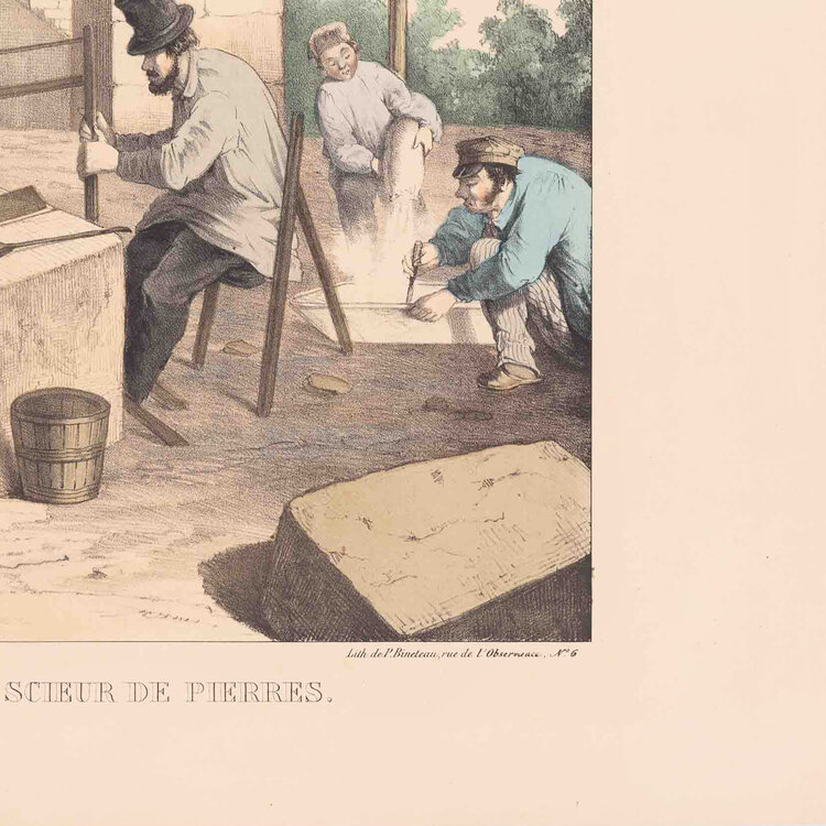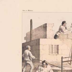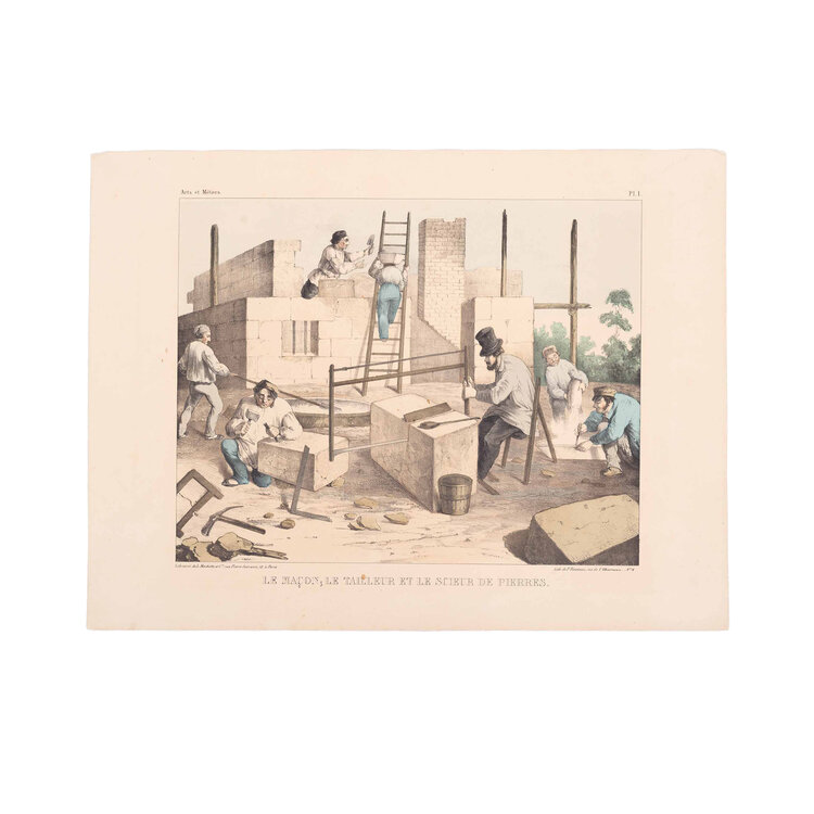 Prent 'Le maçon; le tailleur et le scieur de pierres', lithografie van Pierre de Bineteau. De afbeelding is Pl. 1 uit de serie 'Arts et Métiers' uitgegeven door L. Hachette et Cie. Afgebeeld zijn een metselaar, de steenhouwer en houtzager aan het werk. De litho is met de hand ingekleurd. Datering: ca. 1840. Conditie: goed, met hier en daar vlekjes en verkleuring; rechtsboven is in potlood geschreven: N° 5 ontbreekt. Afmetingen: ca. 35,5 cm x 48,5 cm.