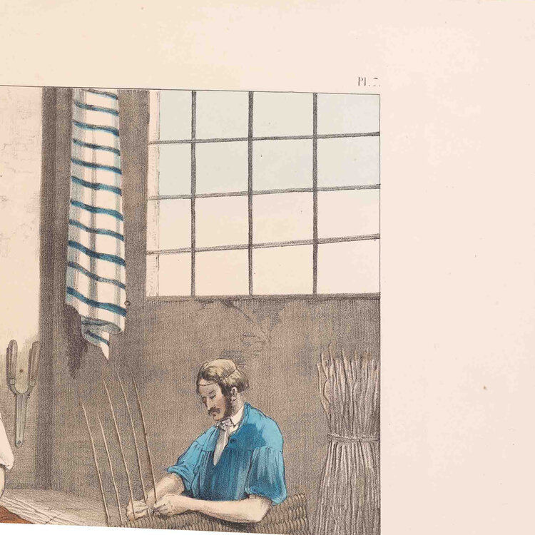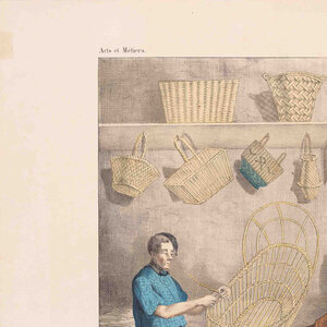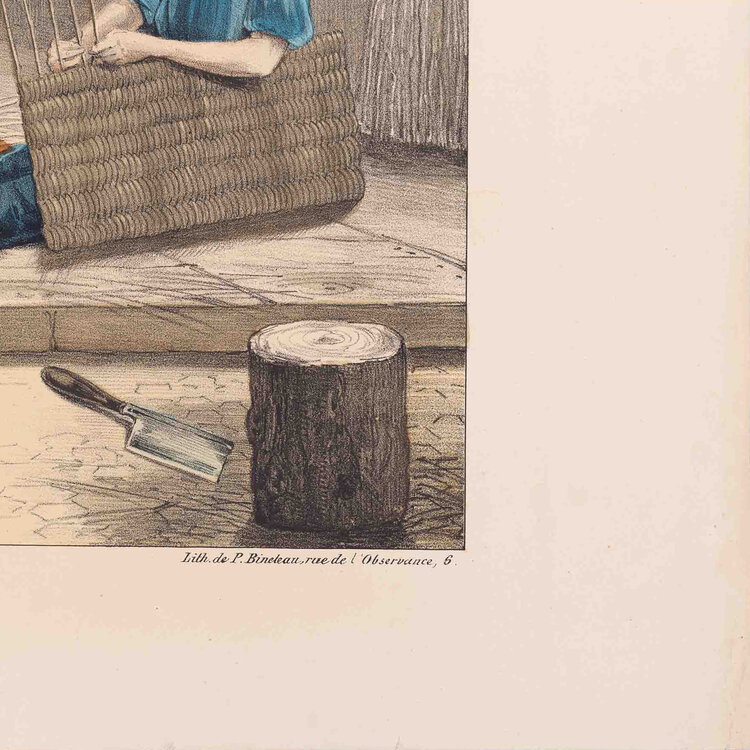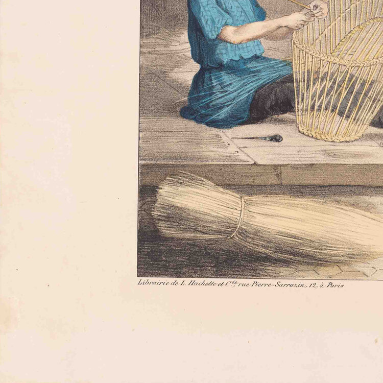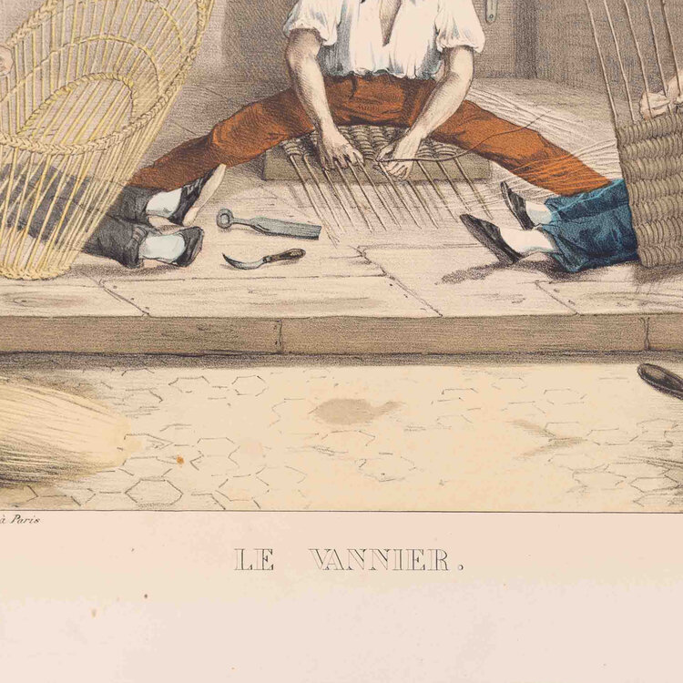 Prent 'Le vannier', lithografie van Pierre de Bineteau. De afbeelding is Pl. 7 uit de serie 'Arts et Métiers' uitgegeven door L. Hachette et Cie. Afgebeeld is de werkplaats van een mandenmaker. De litho is met de hand ingekleurd. Datering: ca. 1840. Conditie: goed, met hier en daar vlekjes en verkleuring; links taperesten. Afmetingen: ca. 35,5 cm x 48,5 cm.