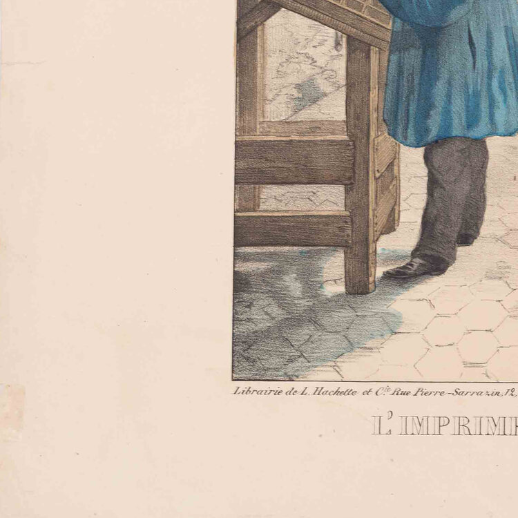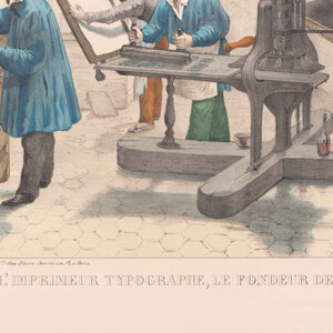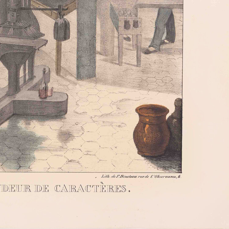 Prent 'L'imprimeur typographe, le fondeur de caractères', lithografie van Pierre de Bineteau. De afbeelding is Pl. 10 uit de serie 'Arts et Métiers' uitgegeven door L. Hachette et Cie. Afgebeeld is de werkplaats van een drukkerij met lithograaf en diepdrukker aan het werk. De litho is met de hand ingekleurd. Datering: ca. 1840. Conditie: goed, met hier en daar vlekjes en verkleuring; links taperesten. Afmetingen: ca. 35,5 cm x 48,5 cm.