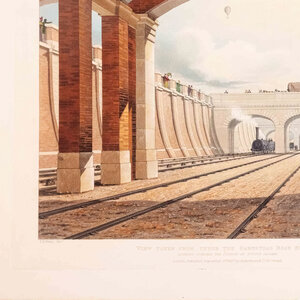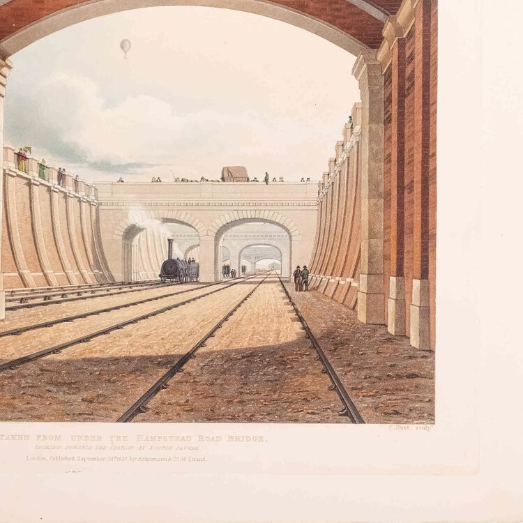 Prent 'London & Birmingham Railroad. Entrance to the tunnel at Watford'. Ets van N. Fielding naar een werk van T.T. Bury, Ackermann & Co. Zicht op de ingang van de Watford tunnel. Plaat 5 uit de collectie 'Six Coloured Views on the London and Birmingham Railway' van Thomas Talbory Bury, gepubliceerd in 1837. The British Museum is ook in het bezit van een exemplaar van deze prent. Datering: 1837. Conditie: De prent heeft sporen van ouderdom. Verkleuring, vlekken en kleine beschadigingen aan de randen. Afmetingen van papier prent: 35,5 x 29,5 cm.