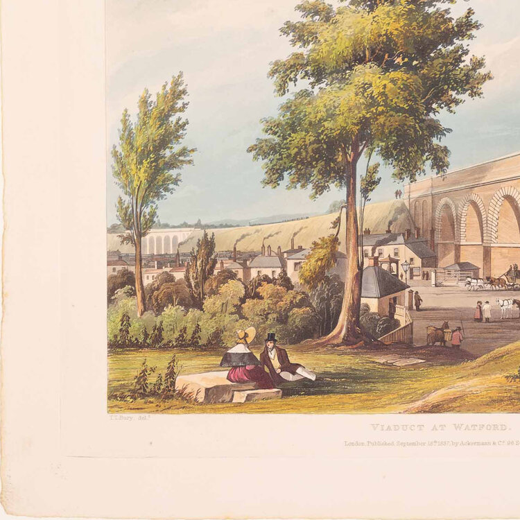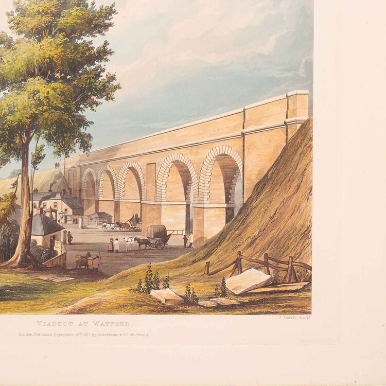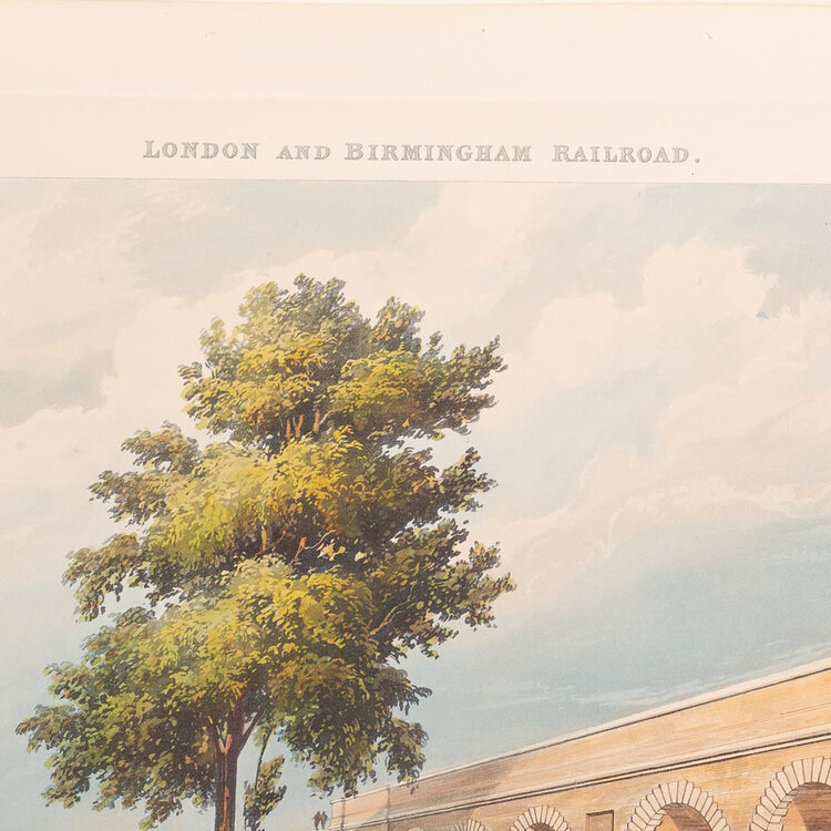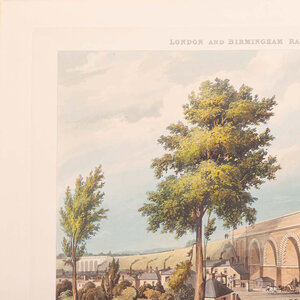 Prent 'London & Birmingham Railroad. View taken from the bridge over the canal, Camden Town'. Ets van N. Fielding naar een werk van T.T. Bury, Ackermann & Co. Afbeelding van bedrijvigheid op een spoorbrug over een kanaal in Camden Town. Plaat 3 uit de collectie 'Six Coloured Views on the London and Birmingham Railway' van Thomas Talbory Bury, gepubliceerd in 1837. The British Museum is ook in het bezit van een exemplaar van deze prent. Datering: 1837. Conditie: De prent heeft sporen van ouderdom. Verkleuring, vlekken en kleine beschadigingen aan de randen. Afmetingen van papier prent: 29,5 x 35,5 cm.