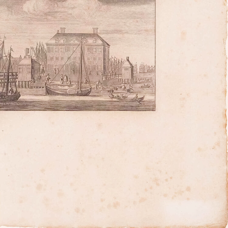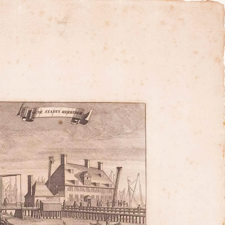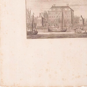 Prent 'Oude stadts herbergh. Nieuwe stadts herbergh'. Een prent met twee gravures van de oude en de nieuwe stadsherberg in Amsterdam. Datering: circa 1726. Conditie: De prent heeft sporen van ouderdom. Duidelijke verkleuring, veel vlekken en kleine beschadigingen aan de randen. Afmetingen van papier prent: 43,5 x 27 cm.
