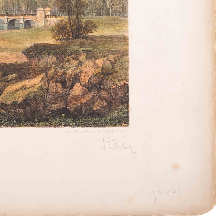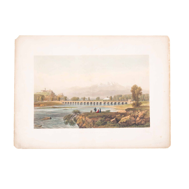 Prent 'Pont sul Po presso Valenza' door R.K. Thomas, C. Bossoli, Day & Son. Litho van het gezicht op Valenza en de brug, op het moment dat de trein passeert. De litho, gedrukt in kleur, maakt deel uit van een verzameling van zestien vergezichten om de voltooiing van de spoorlijn Turijn-Genua te vieren. Datering midden 19e eeuw. Conditie: De prent heeft sporen van ouderdom, zoals vlekken en verkleuring. Beschadigingen aan de randen, linkerbovenhoek is afgescheurd. Afmetingen: ca. 44 x 62 cm.