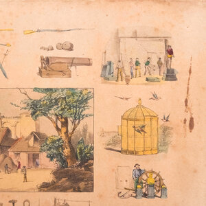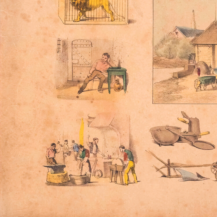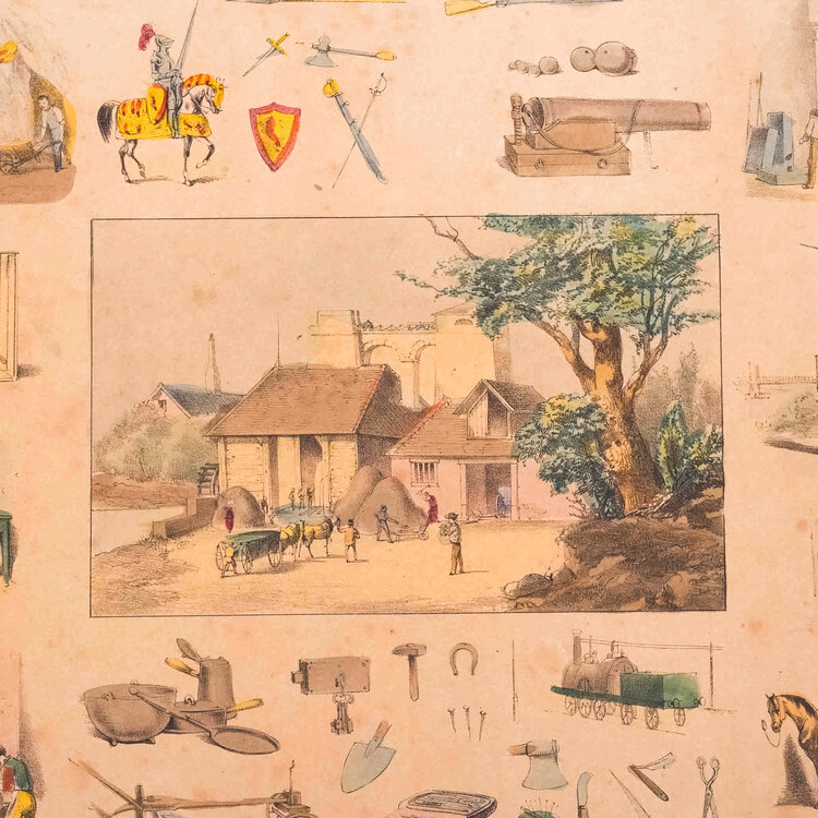 Prent 'Bereiding en toepassing van ijzer'. Ingekleurde litho met afbeeldingen van de bereiding van ijzer en een aantal voorbeelden waarin ijzer wordt toegepast. Datering onbekend. Conditie: De prent heeft sporen van ouderdom. Verkleuring, vlekken, vouwtjes en kleine beschadigingen aan de randen. Afmetingen van papier prent: 32 x 45 cm.