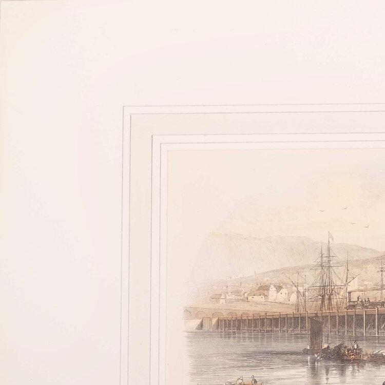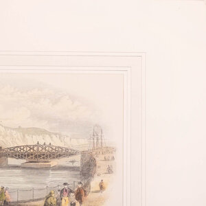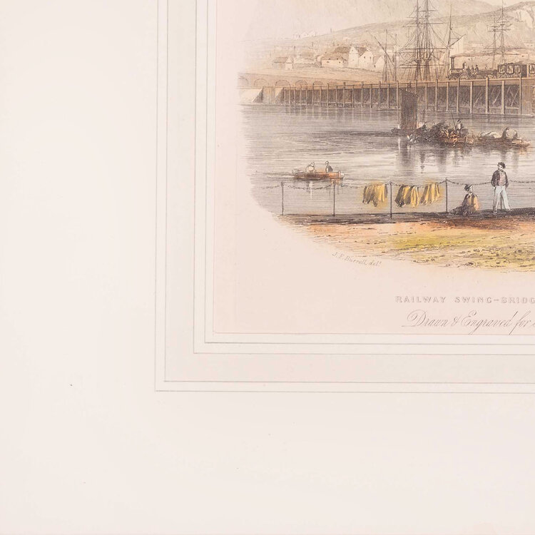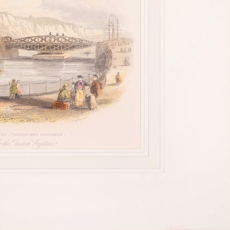 Prent 'Railway Swing-Bridge, Folkestone harbour', getekend door J.F. Burrell. Gegraveerd door A. Ashley. Getekend en gegraveerd voor de British Gazetteer. Uitgegeven door H.G. Collins, Londen. Gravure van The Railway Swing Bridge, in haven van Folkestone. Datering: circa 1851. Conditie: De prent heeft sporen van ouderdom. Verkleuring, vlekken en kleine beschadigingen aan de randen. Afmetingen van papier prent: ca. 16,5 x 25 cm.