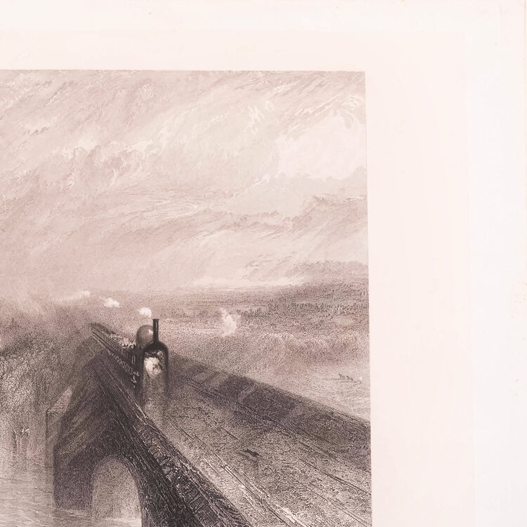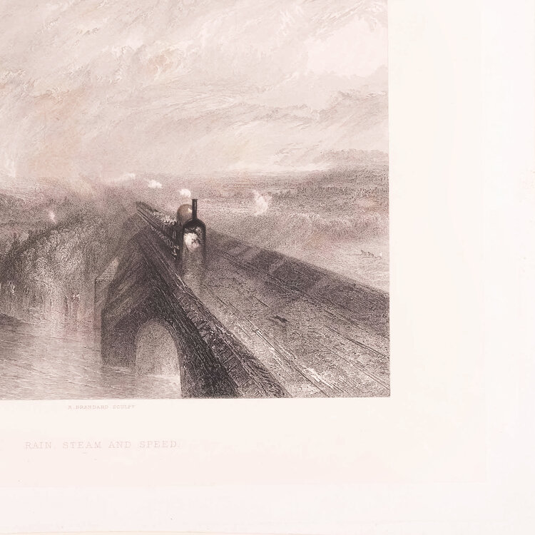 Prent 'Rain, steam and speed'. Gravure van R. Brandard, naar een werk van Joseph Mallord William Turner, in blankhouten lijst. Een locomotief raast over een spoorbrug van de The Great Western Railway. Datering: circa 1860. Conditie: De prent heeft sporen van ouderdom. Verkleuring, vlekken en kleine beschadigingen aan de randen; gebruikssporen lijst. Afmetingen: lijst ca. 32,5 x 43,5 cm; papier prent: ca. 24,5 x 33,5 cm.