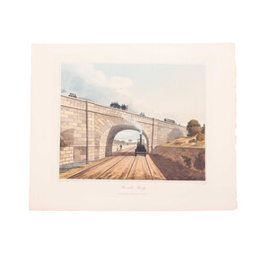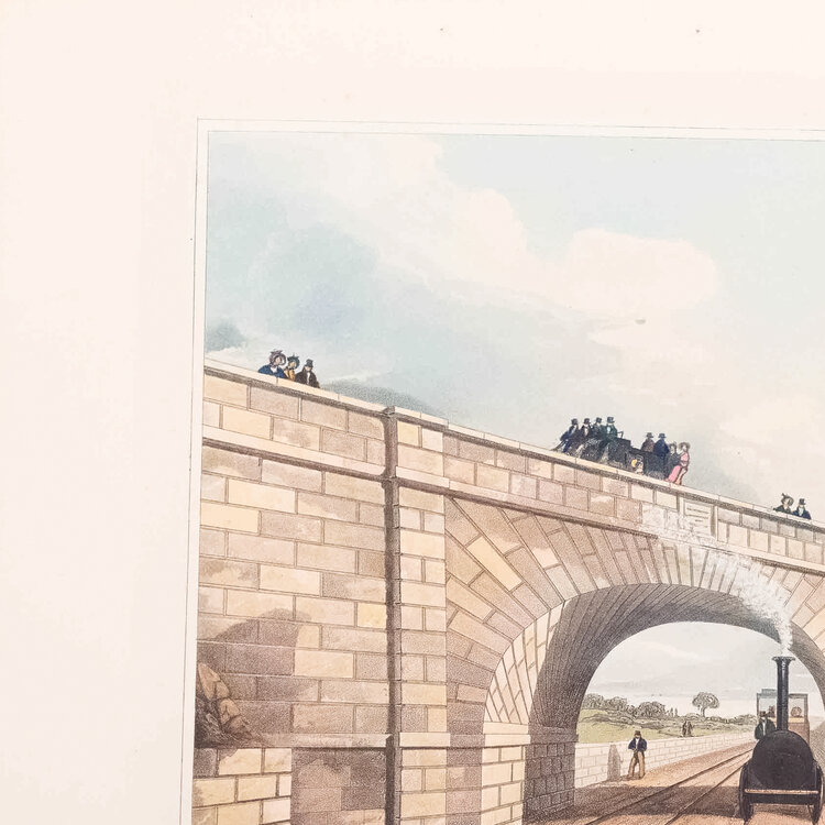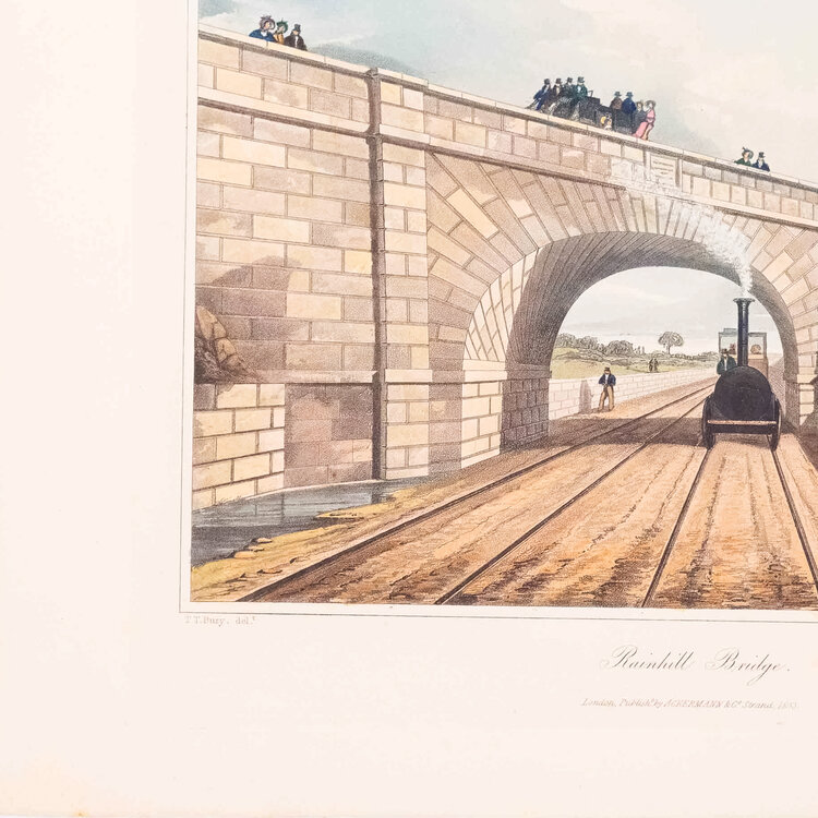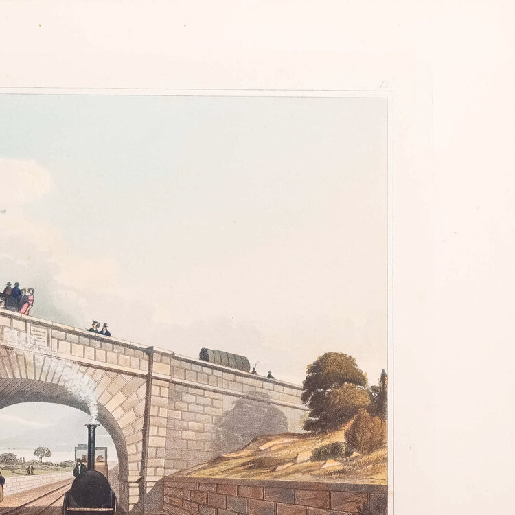 Prent 'Rainhill Bridge'. Ingekleurde aquatint van Henry Pyall (1795-1833) naar een aquarel van Thomas Talbory Bury (1809-1877). Uitgeverij Ackermann & Co. De 'scheve' brug staat naast het treinstation van Rainhill aan the Liverpool & Manchester Railway'. De brug is nog steeds in gebruik en staat op de monumentenlijst. Plaat 12 uit 'Coloured views of the Liverpool & Manchester Railway' (Londen, 1832-1833). Datering: circa 1833. Conditie: De prent heeft sporen van ouderdom. Verkleuring, vlekken en kleine beschadigingen aan de randen. Afmetingen van papier prent: 29 x 35 cm.