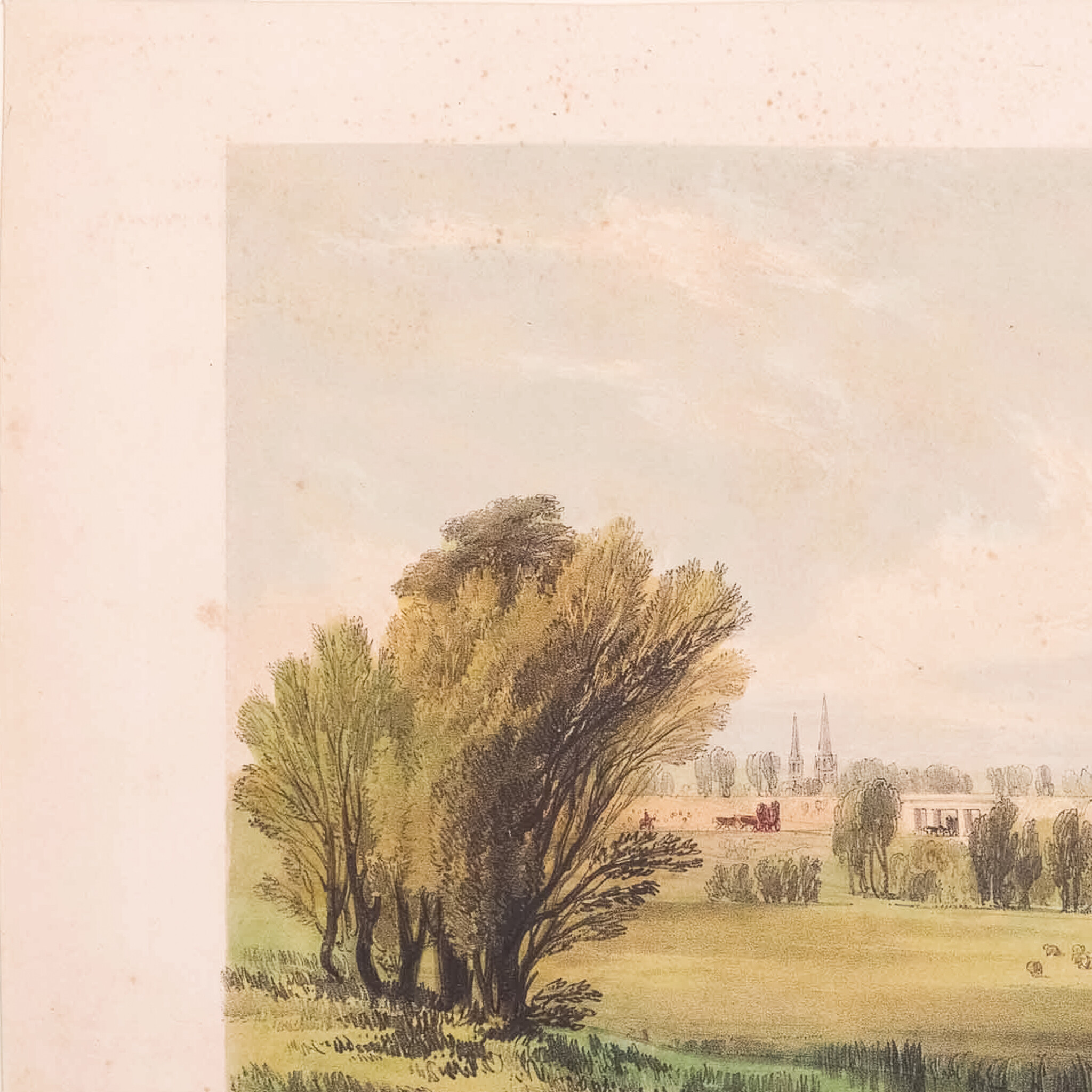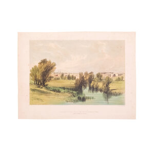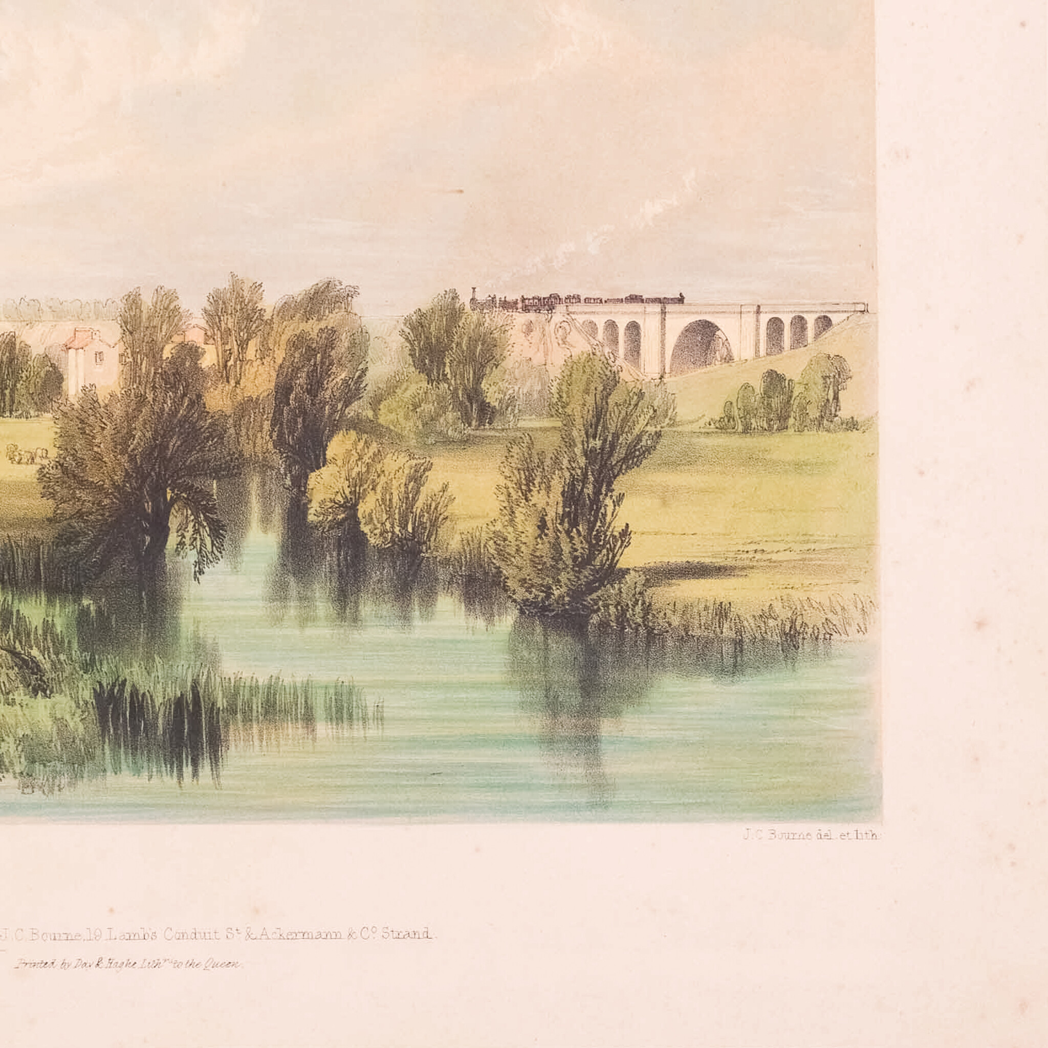 Prent 'Sherbourne viaduct, near Coventry'. Litho van J.C. Bourne, Day & Haghe, Ackermann & Co. Kleurenafbeelding van een landschap met op de achtergrond een trein rijdend over een viaduct. Datering: circa 1839. Conditie: De prent heeft sporen van ouderdom. Verkleuring, vlekken en kleine beschadigingen aan de randen. Afmetingen van papier prent: ca. 24,5 x 33,5 cm.