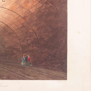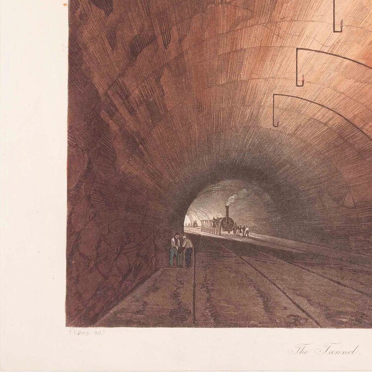 Prent 'The Tunnel', gegraveerd door H. Pyall naar T.T. Bury. De Tunnel in Liverpool, onderdeel van the Liverpool and Manchester Railway. Het was de eerste passagiersspoorlijn ter wereld en werd geopend op 15 september 1830. Uit de serie: Coloured Views on the Liverpool and Manchester Railway. Datering: circa 1831. Conditie: De prent heeft sporen van ouderdom. Verkleuring, vlekken en kleine beschadigingen aan de randen. Afmetingen van papier prent: ca. 26 x 36 cm.